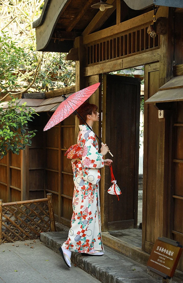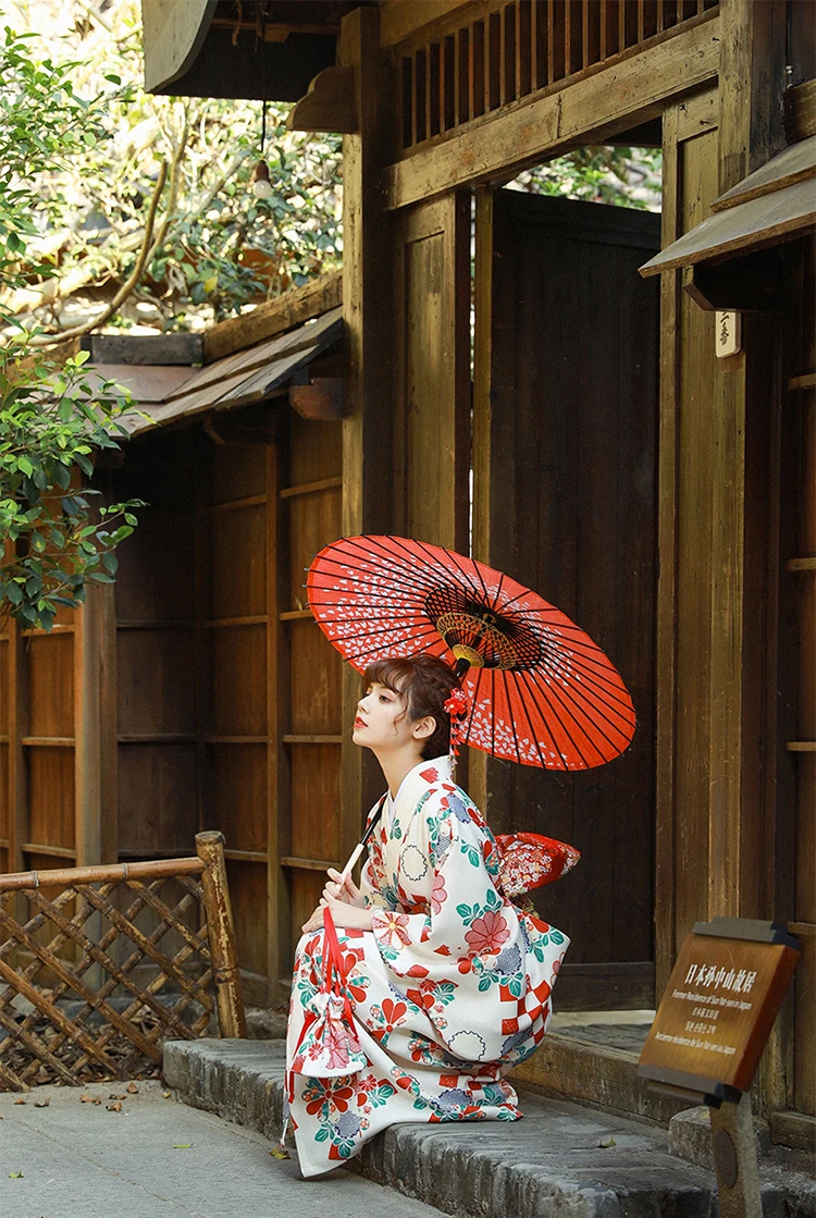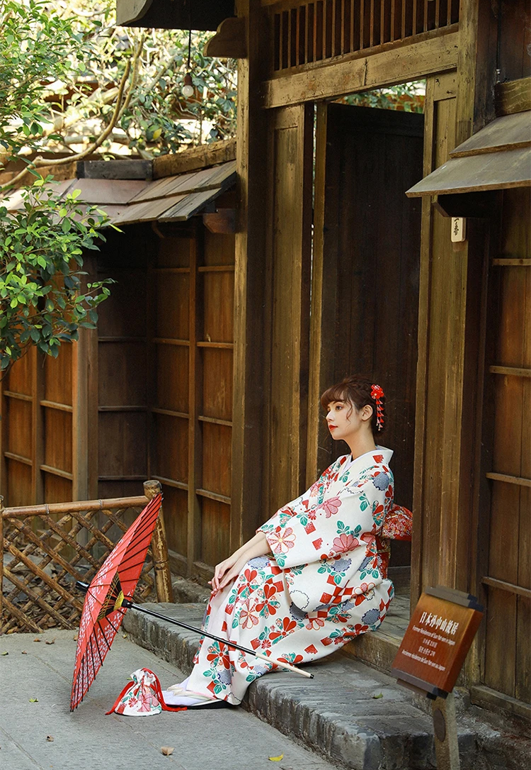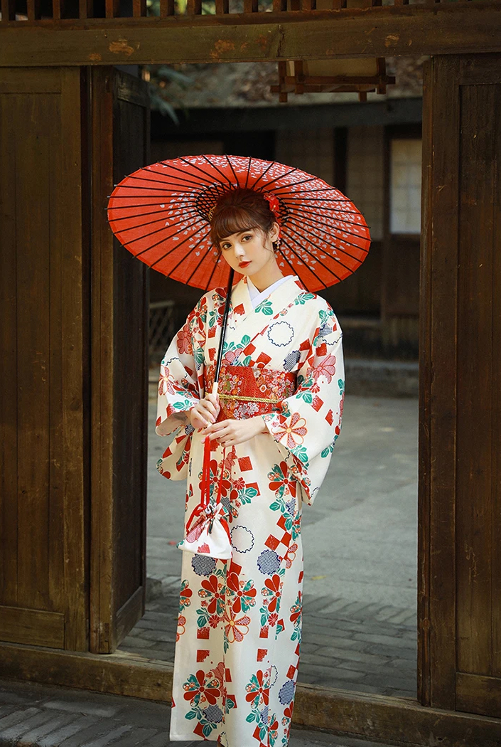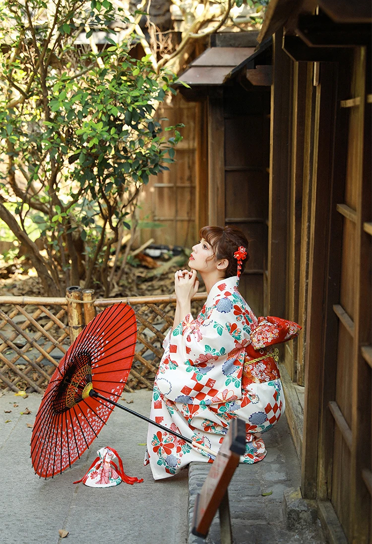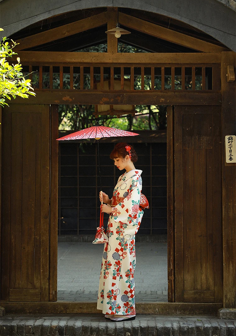 Áo Yukata Trắng Nền Hoa Caro Đỏ