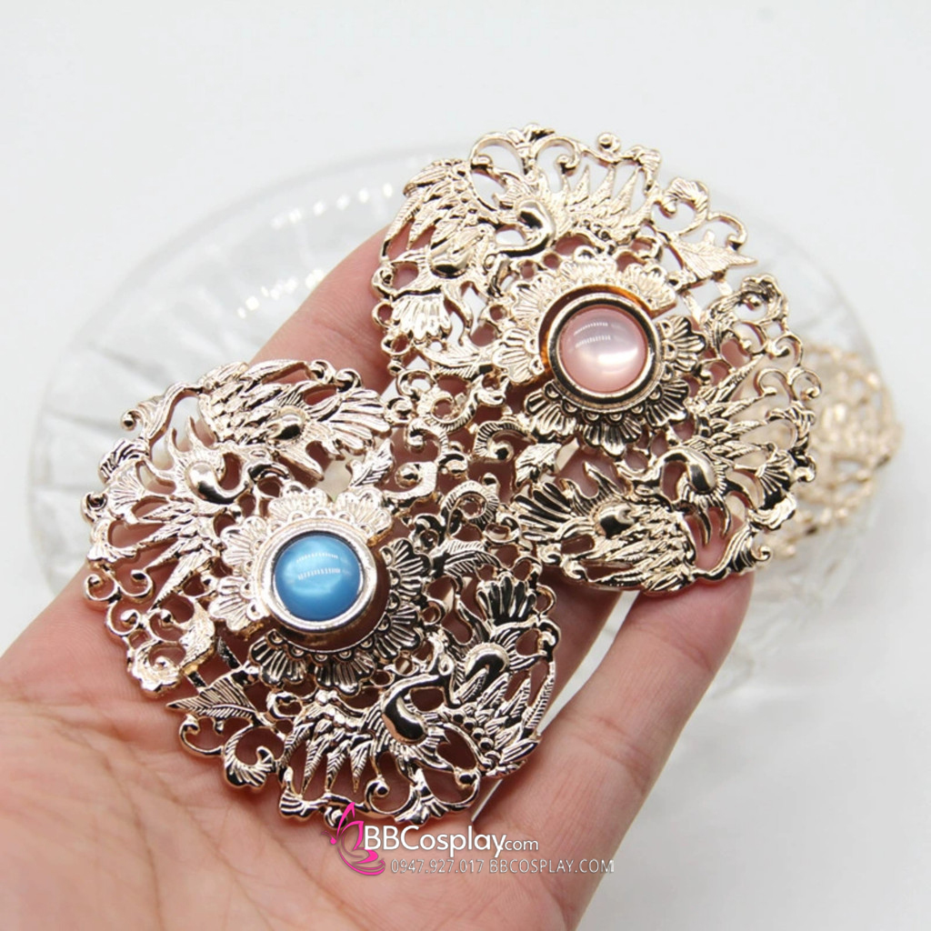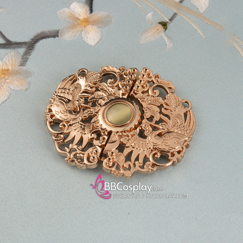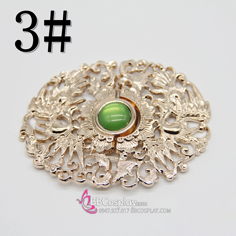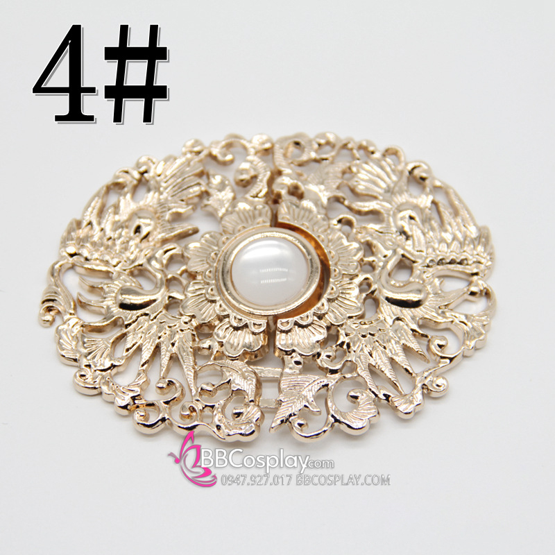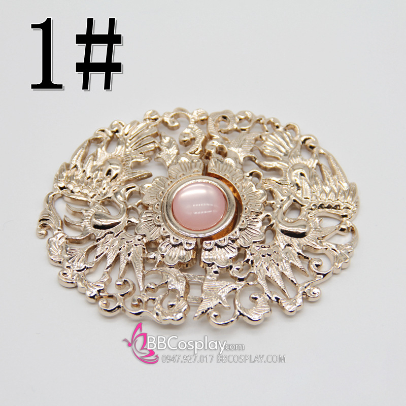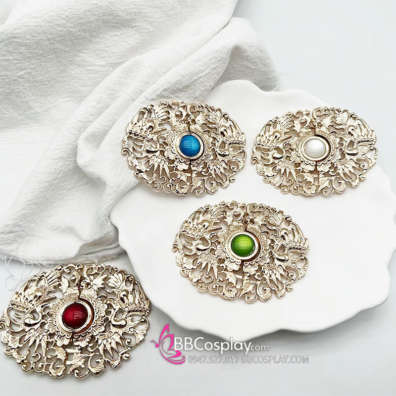 - Mẫu khuy cài gắn áo bằng hợp bền màu hình chim phụng 2 bên chính giữa gắn kèm đá mắt mèo.