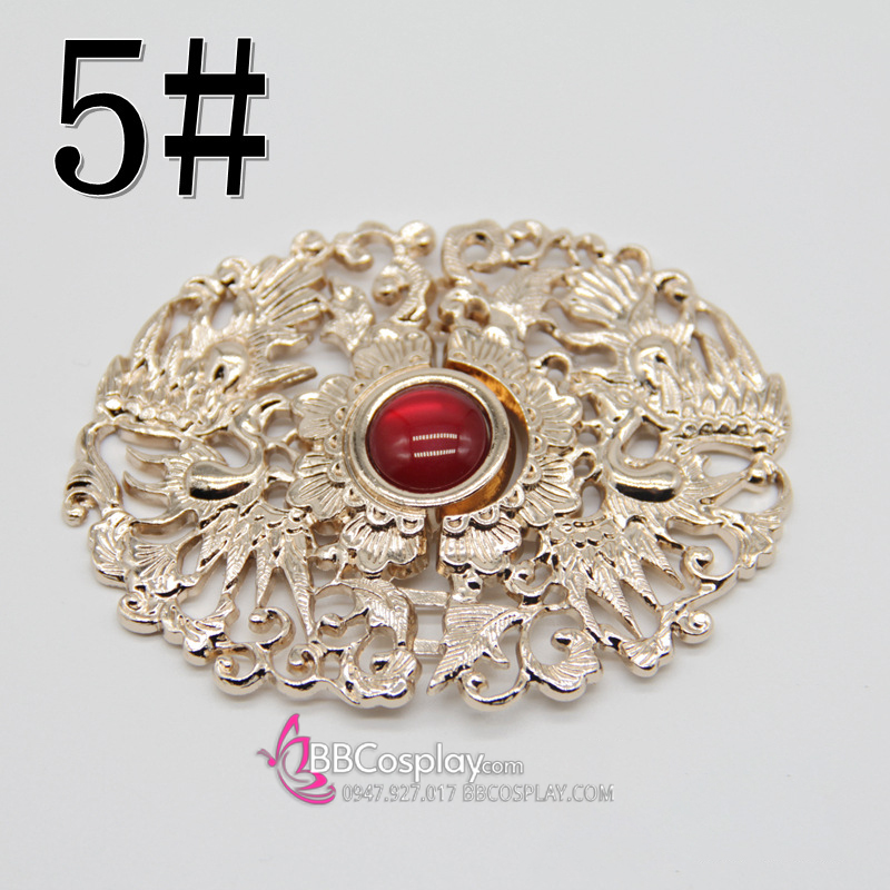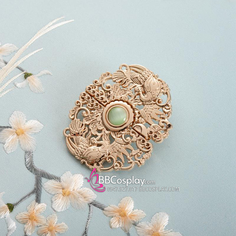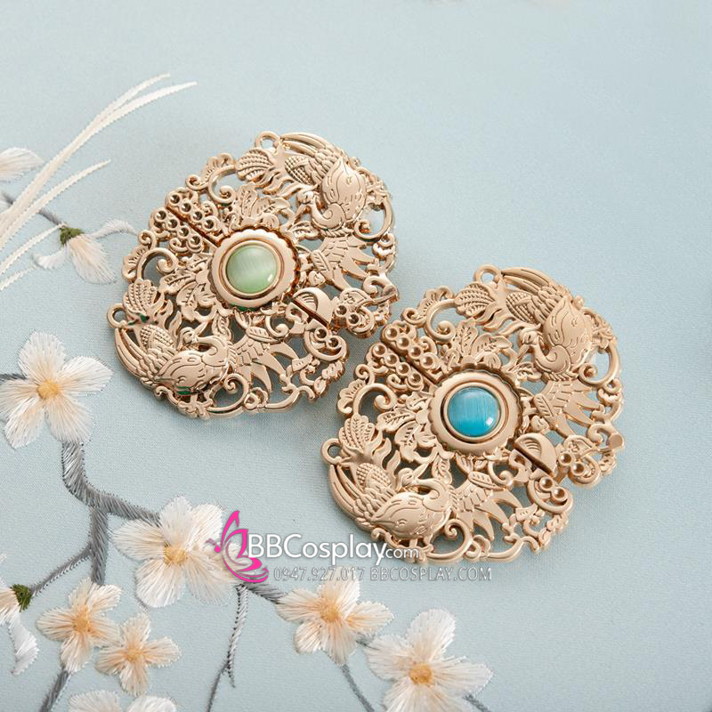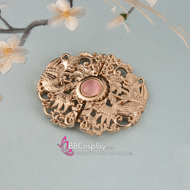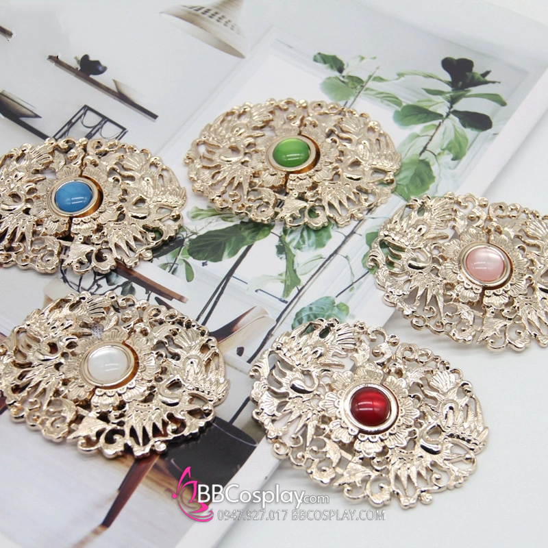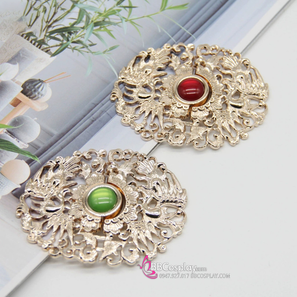 - Mẫu khuy cài gắn áo bằng hợp bền màu hình chim phụng 2 bên chính giữa gắn kèm đá mắt mèo.