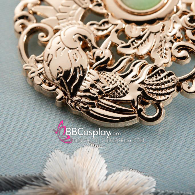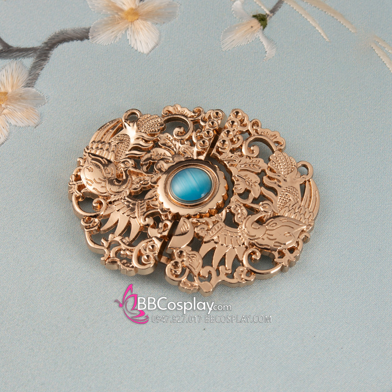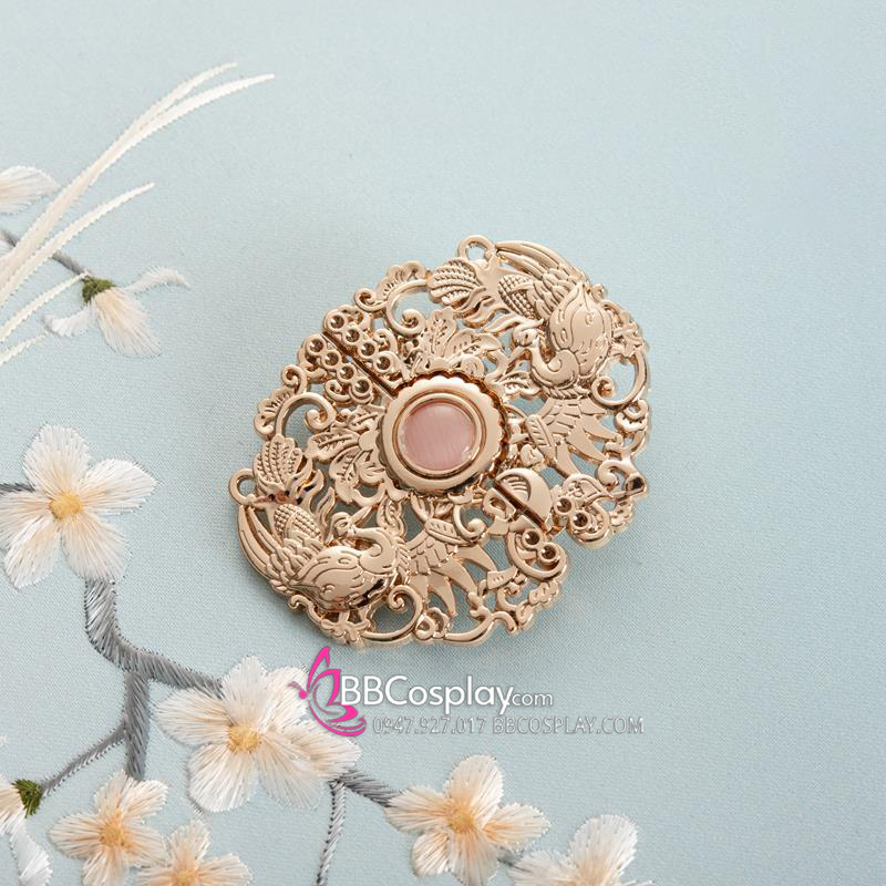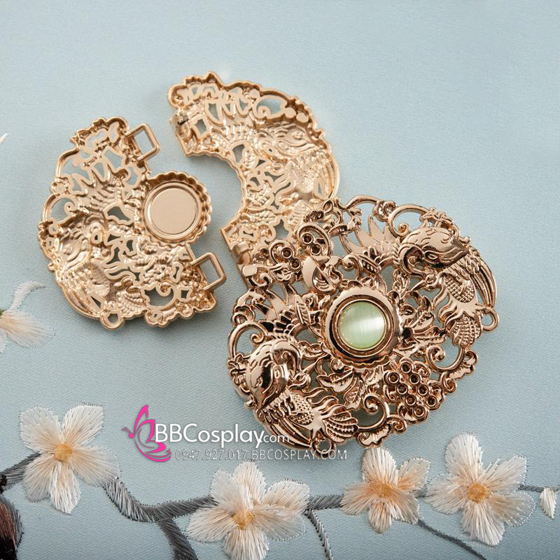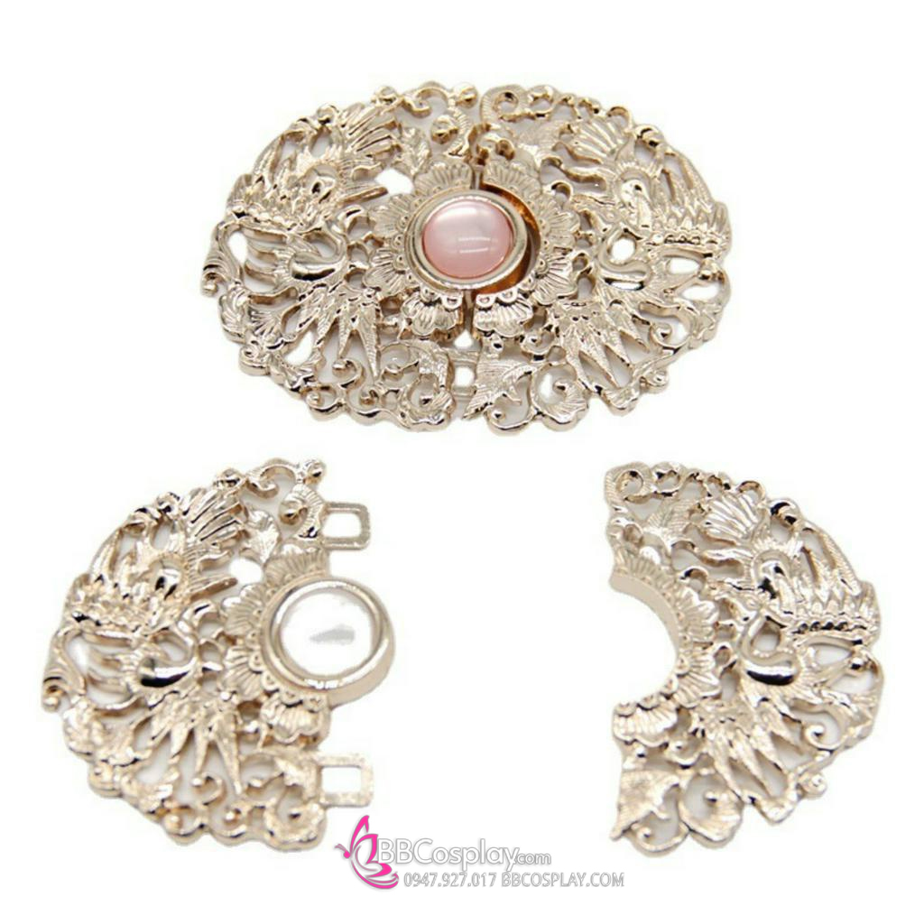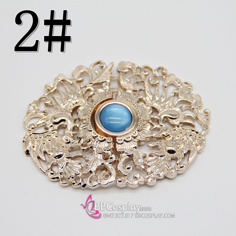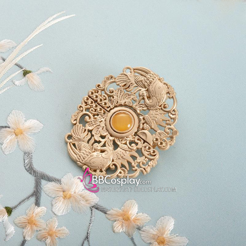 - Mẫu khuy cài gắn áo bằng hợp bền màu hình chim phụng 2 bên chính giữa gắn kèm đá mắt mèo.