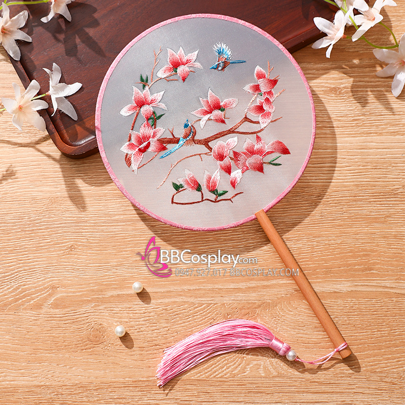 Quạt Tròn Thêu Hoa Màu Hồng