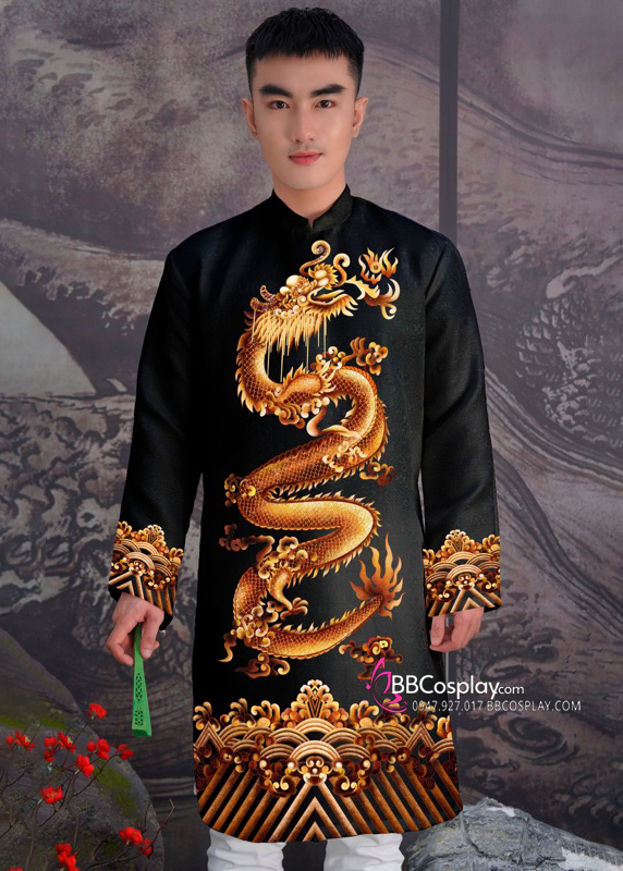 Áo Dài Nam Cách Tân Đen In Hình Rồng Vàng