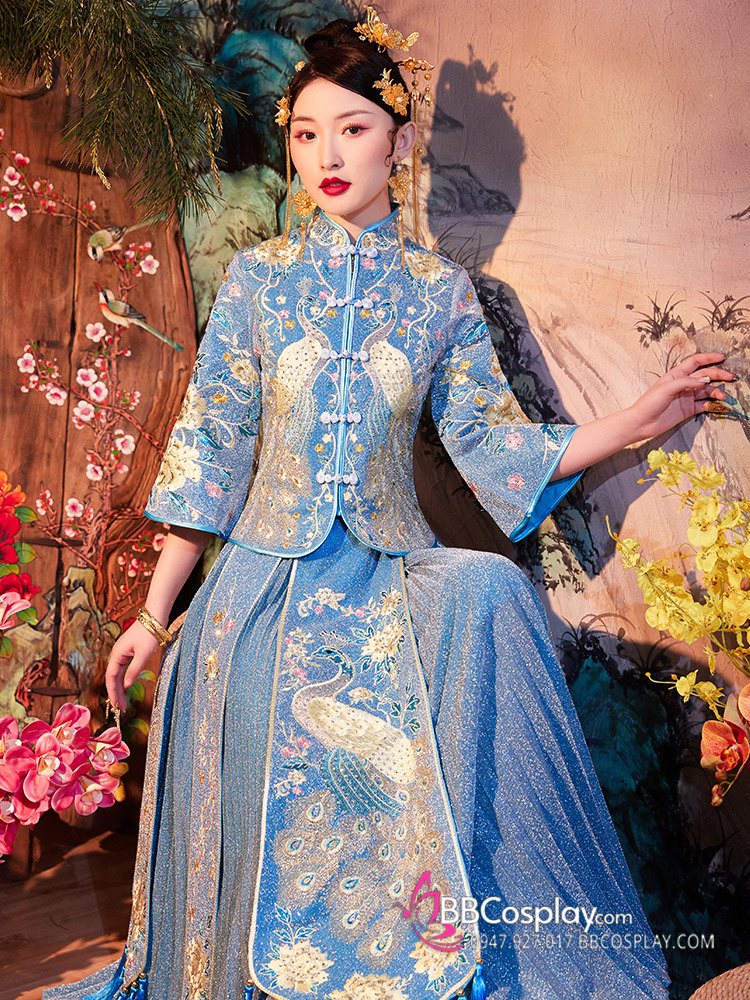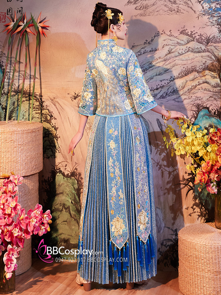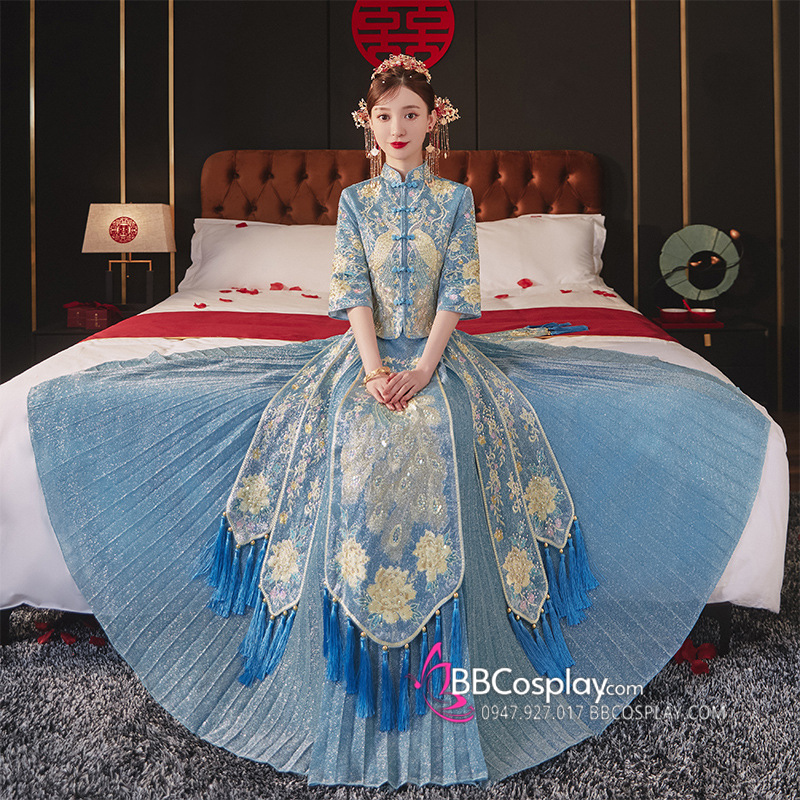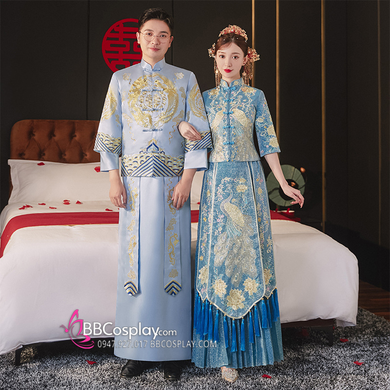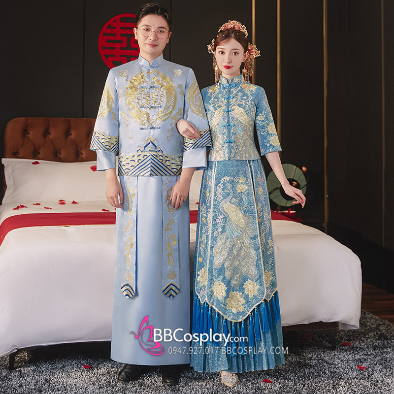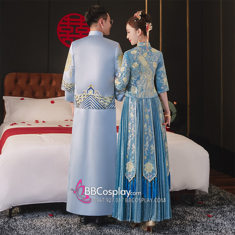 Hỉ Phục Tân Nương Tone Xanh Dương Cặp Long Phục Mới 2024