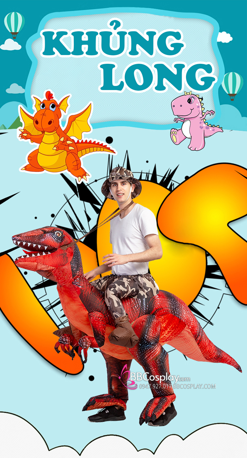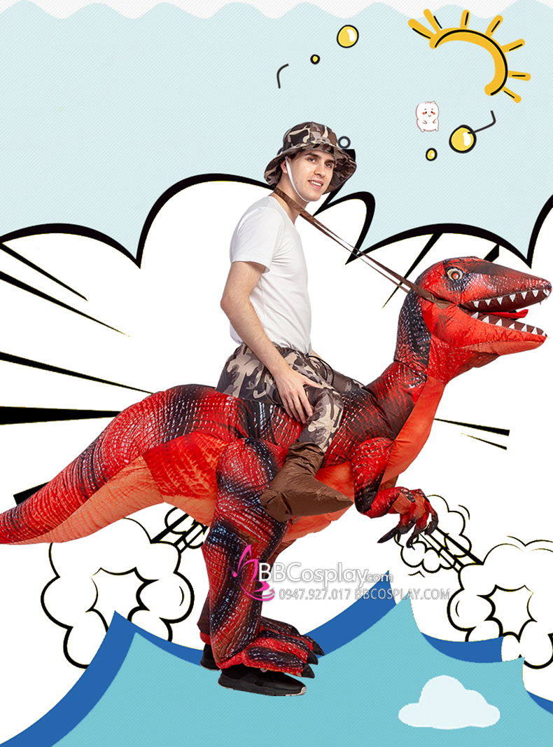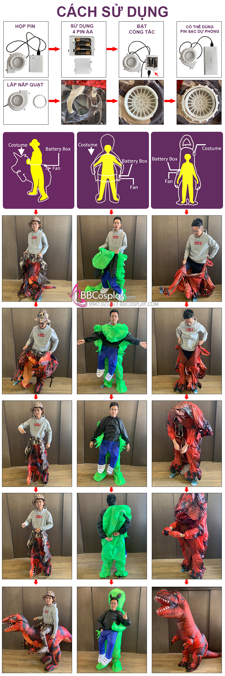 Thành phần: bộ đồ khủng long + nón + phụ kiện bơm (quạt + hộp pin)