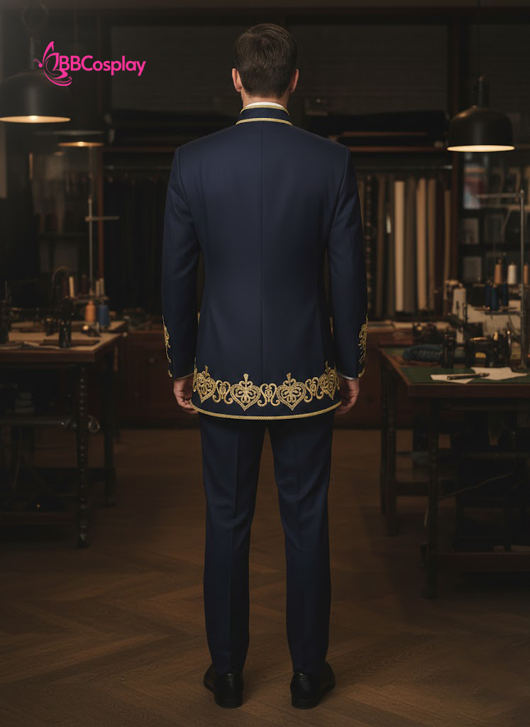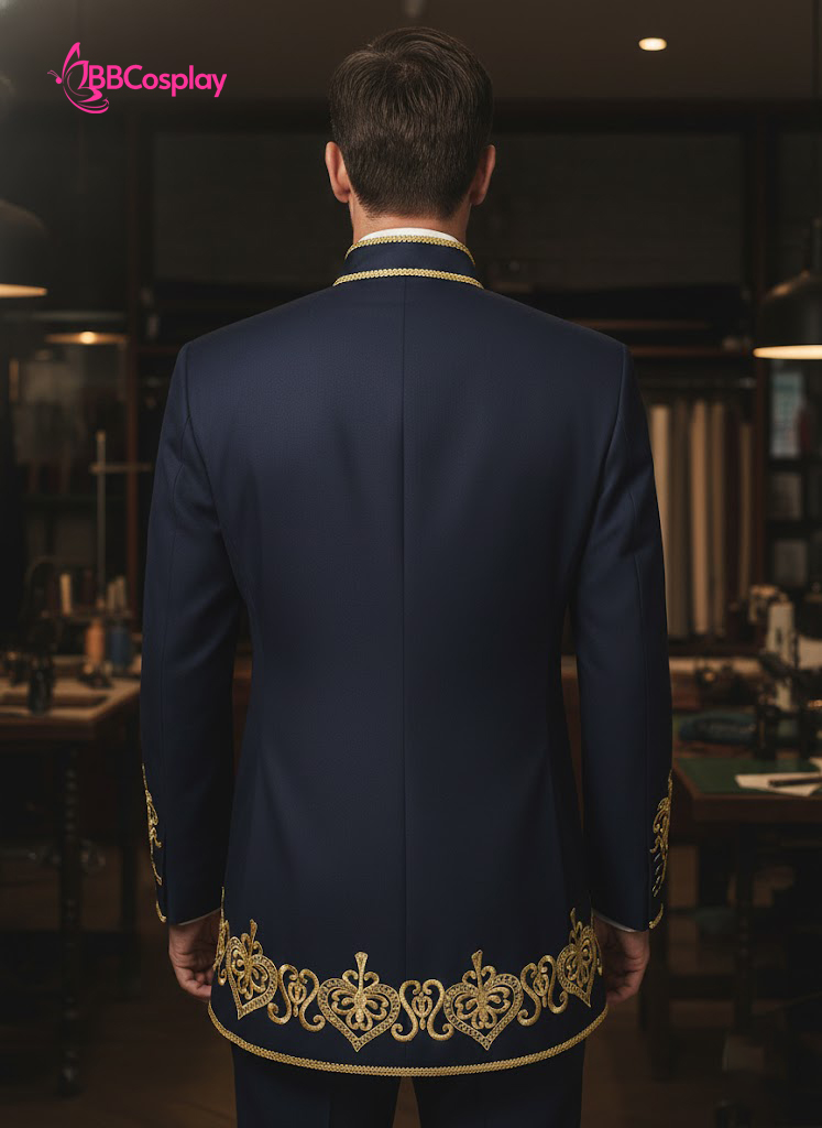 Đánh thức vẻ đẹp vương giả, bộ trang phục là sự giao thoa tinh tế giữa phong cách Baroque cổ điển và phom dáng hiện đại. Trên nền vải xanh đen (Midnight Blue) lịch lãm, các họa tiết thêu chỉ vàng được bố trí đối xứng chạy dọc ve áo và cổ tay, tạo nên hiệu ứng thị giác cực kỳ lộng lẫy.