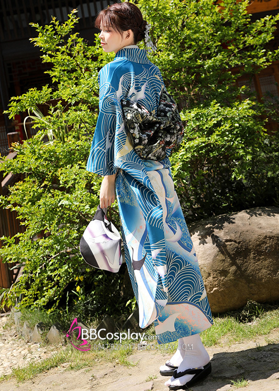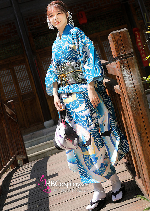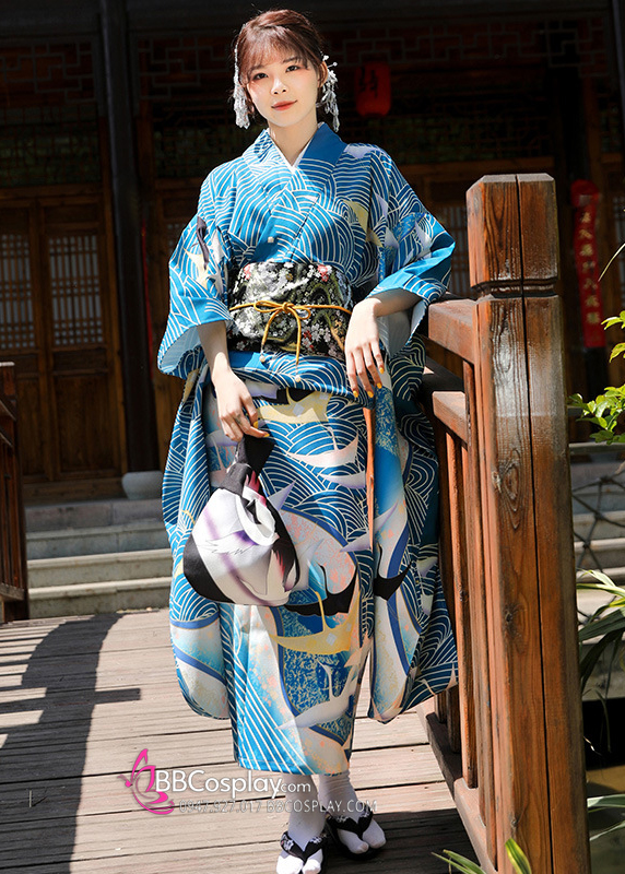 Furisode Kimono Zashu Tazo - Xanh Sóng Biển Và Đàn Hạc