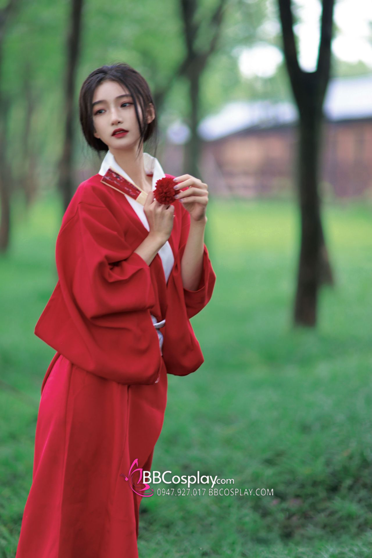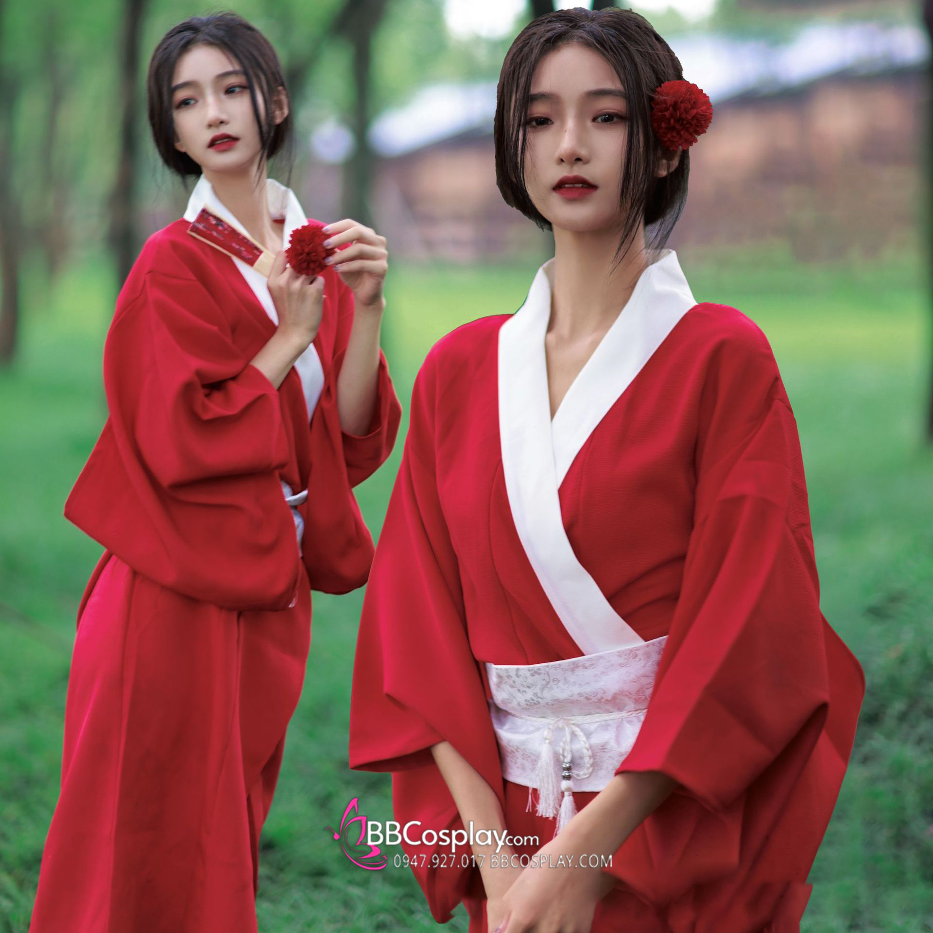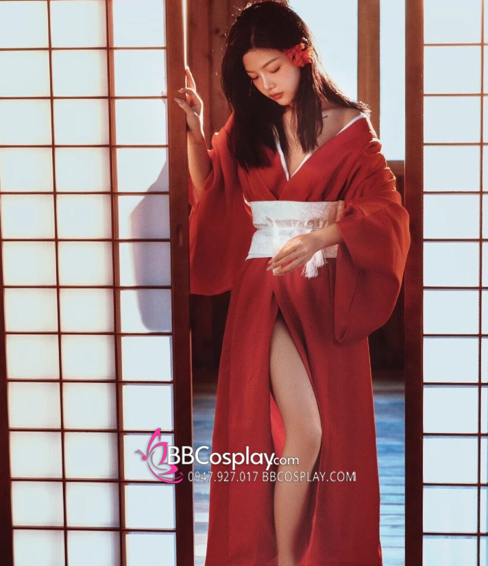 Áo Yukata Đỏ Trơn Cổ Trắng Tặng Kèm Thắt Lưng