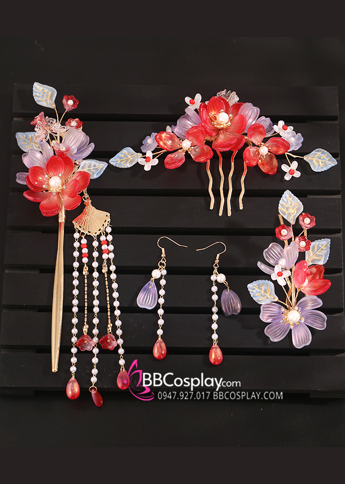 Bộ 5 Món Trâm Cài Cổ Trang Hoa Đỏ Cánh Tím
