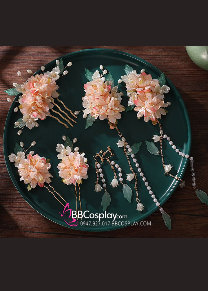 Thành phần: bộ 7 món ( 1 phím giữa + 2 kẹp hoa lớn + 2 hoa tai + 2 trâm cài)