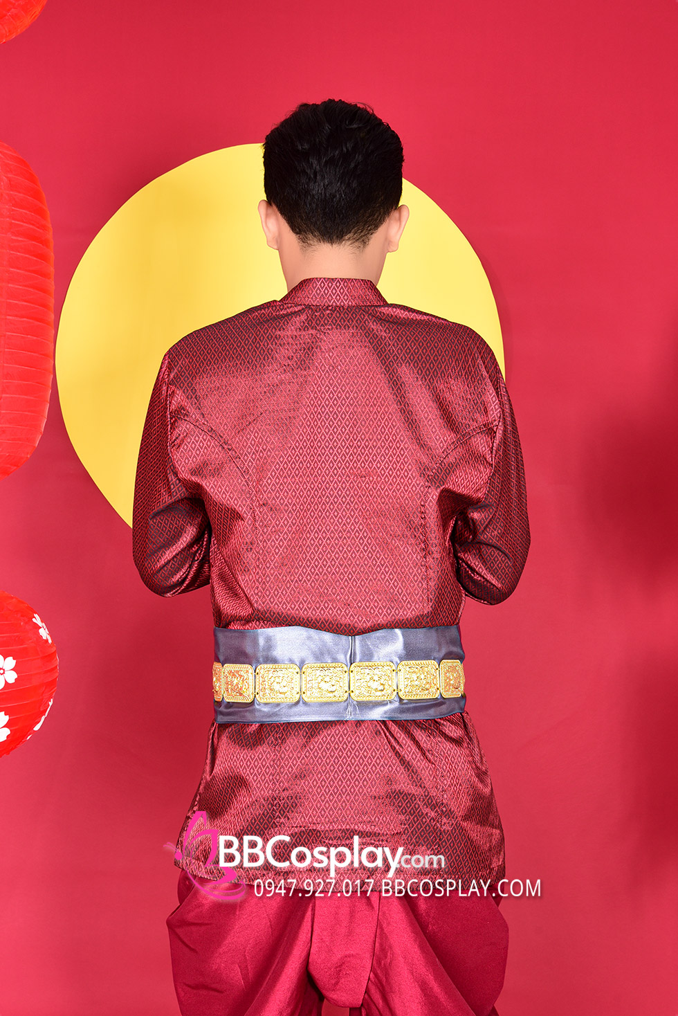 Thành phần: bộ Nam (áo + quần + thắt lưng vải màu xám) + bộ nữ ( áo + váy + khăn quấn )
