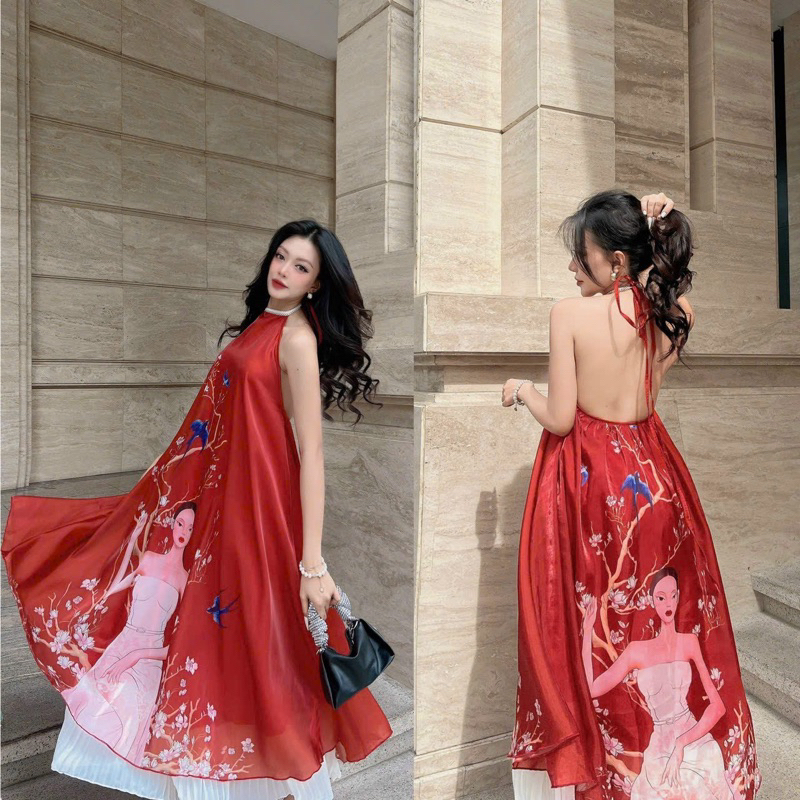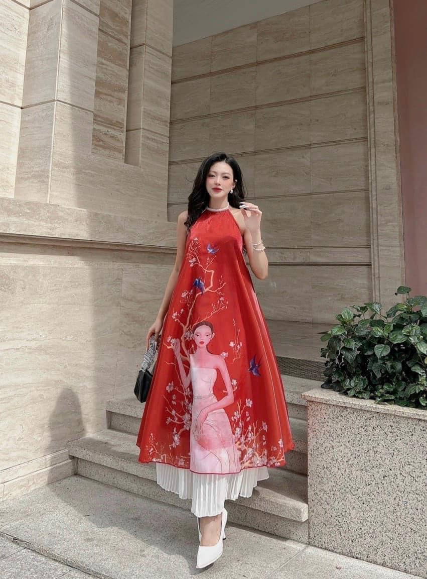 Đầm Yếm Đỏ Váy Xếp Ly Trắng Chụp Ảnh Tứ Thân - Hoạ Tiết Cô Gái Và Mùa Xuân