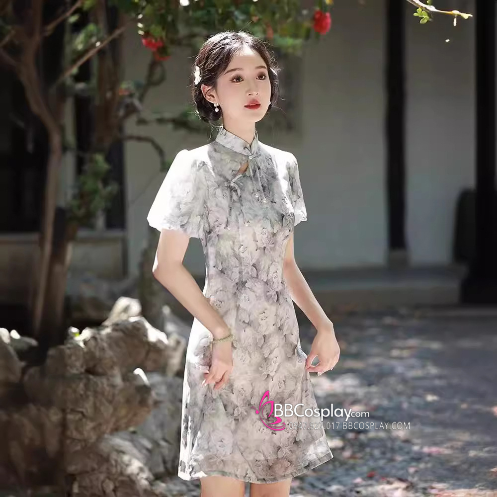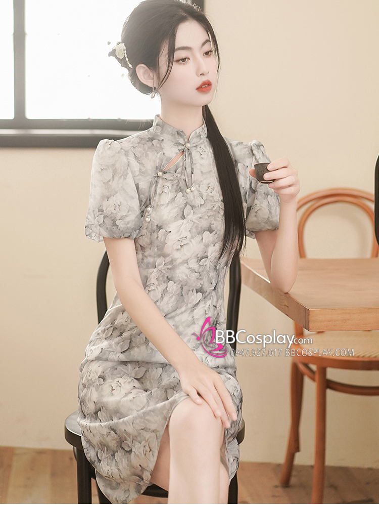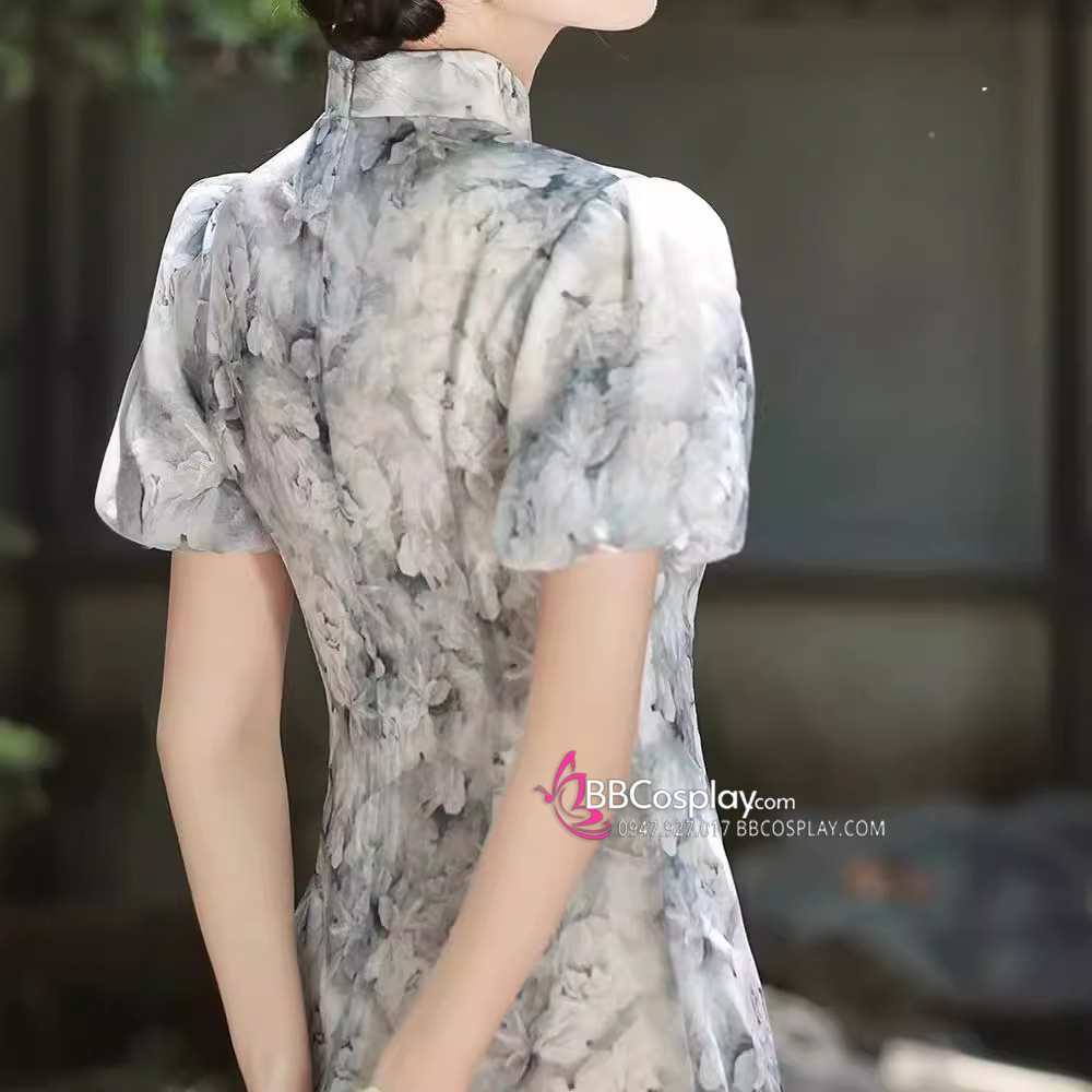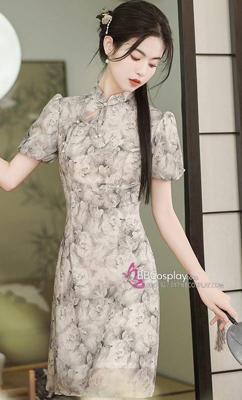 Sườn Xám Voan Nền Hoa Đen Trắng