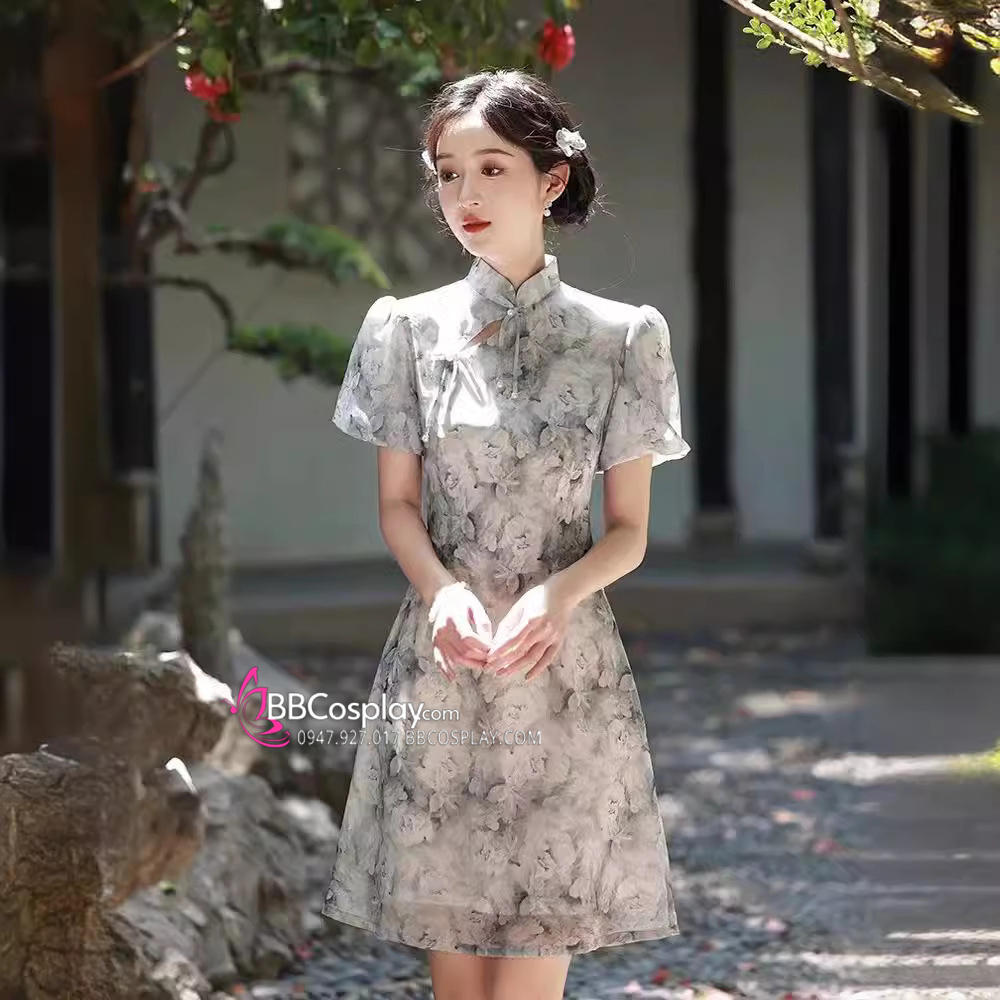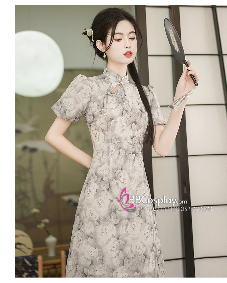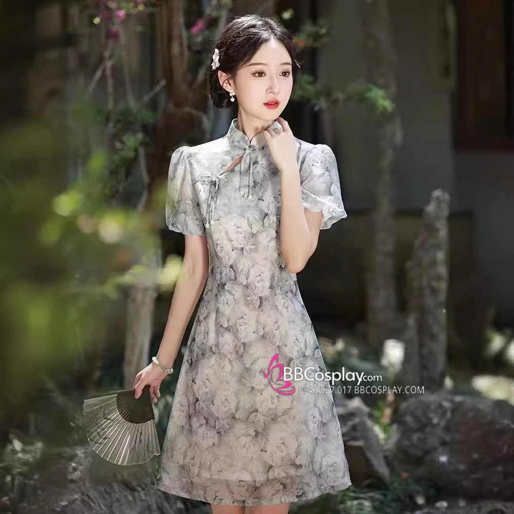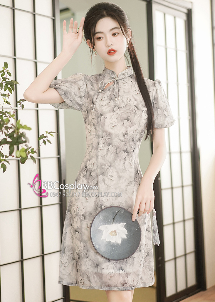 Sườn Xám Voan Nền Hoa Đen Trắng