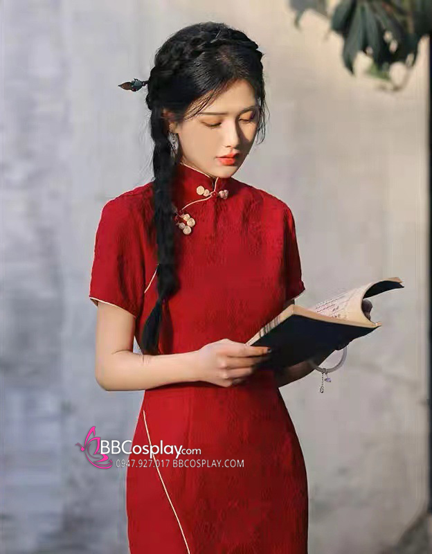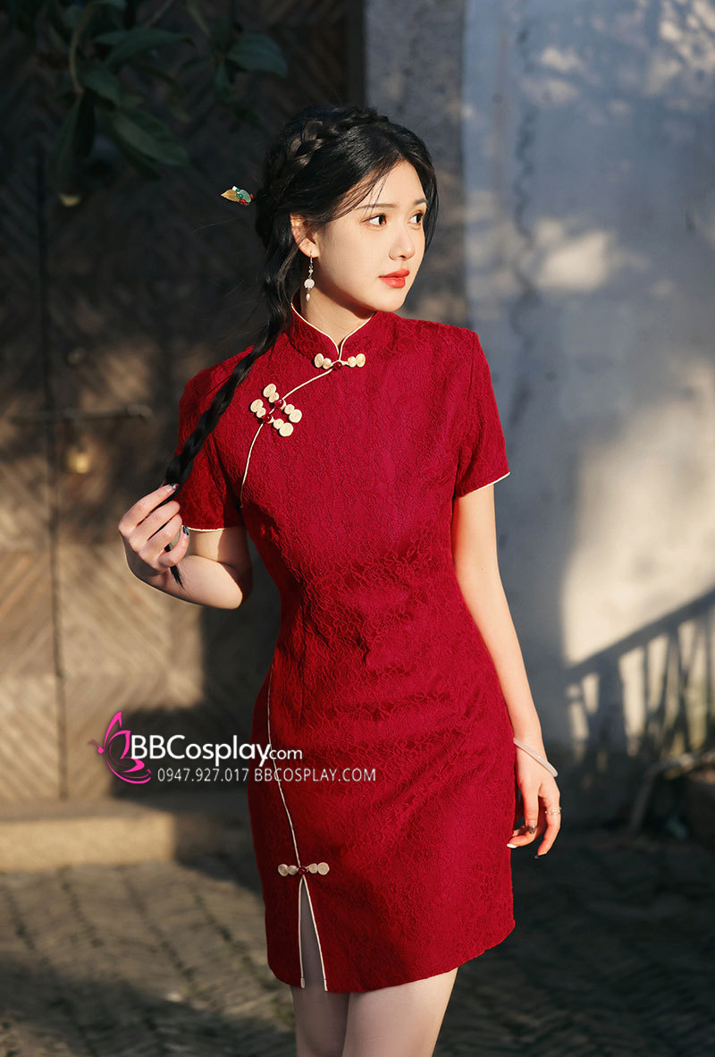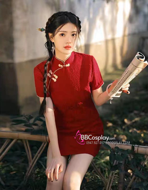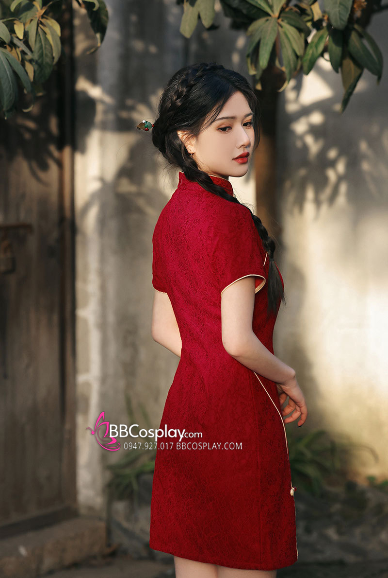 Sườn Xám Đỏ Dáng Ngắn Viền Vàng Cúc Ngọc Đỏ