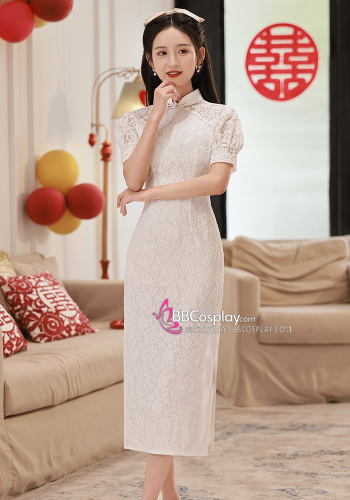 Sườn Xám Trắng Ren Dáng Dài Trắng Tinh Khôi Cho Nàng Dâu