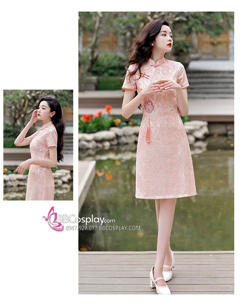 Sườn Xám Ren Hiện Đại Dáng Ngắn Kèm Tua Rua - Màu Cam