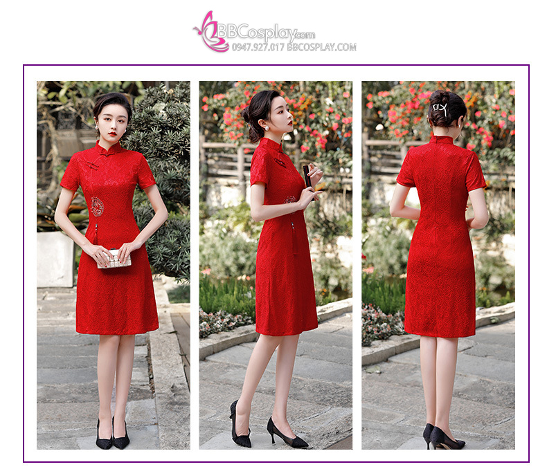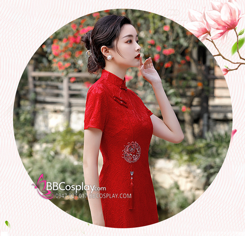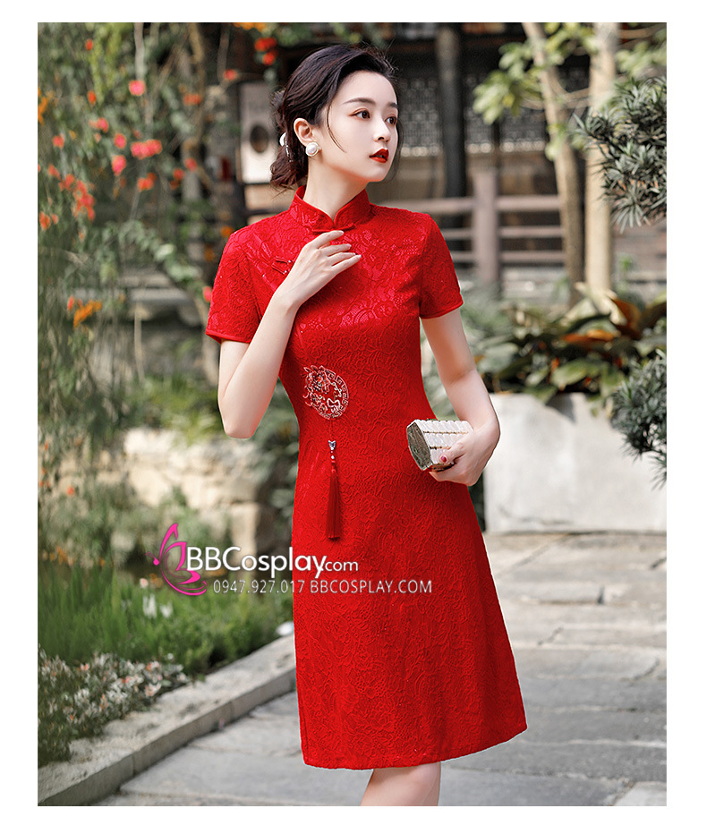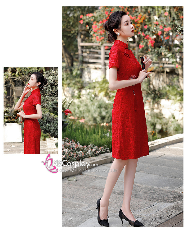 Sườn Xám Ren Hiện Đại Dáng Ngắn Kèm Tua Rua - Màu Đỏ