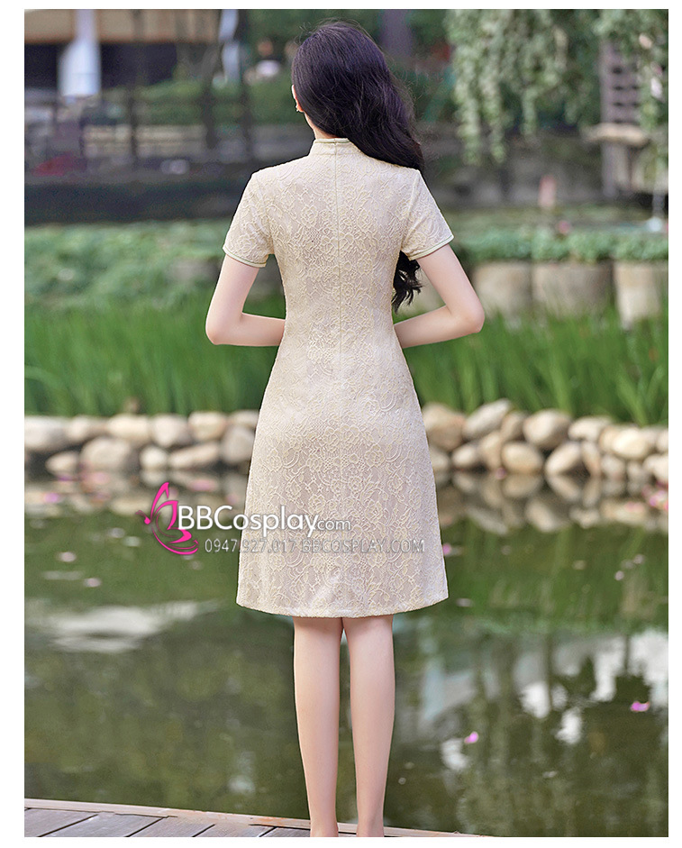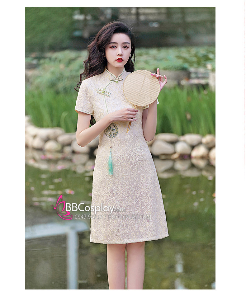 Sườn Xám Ren Hiện Đại Dáng Ngắn Kèm Tua Rua - Màu Kem