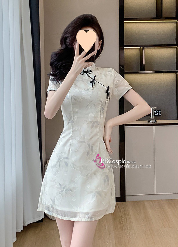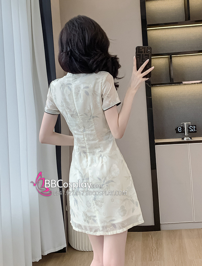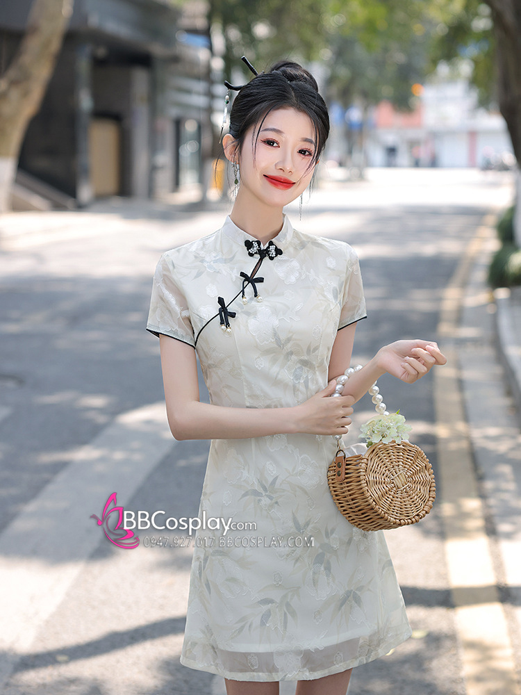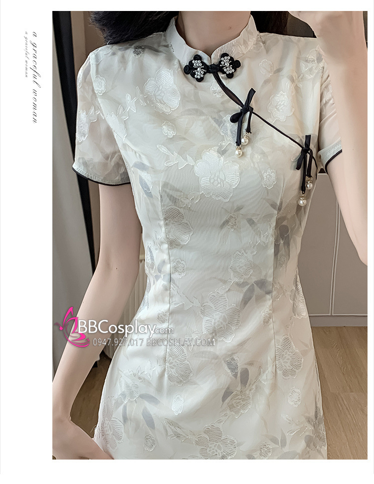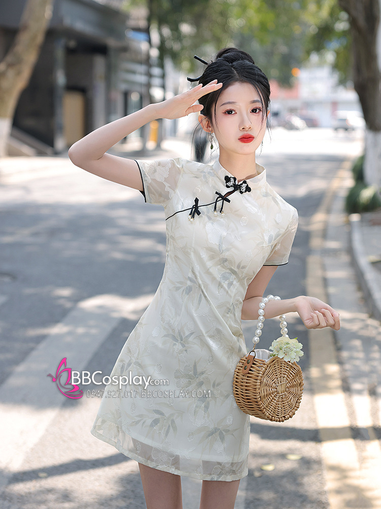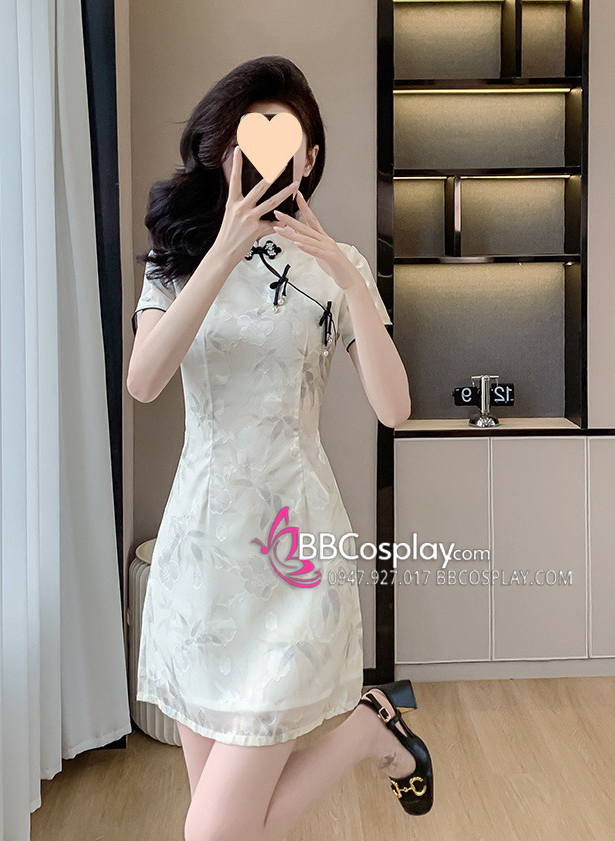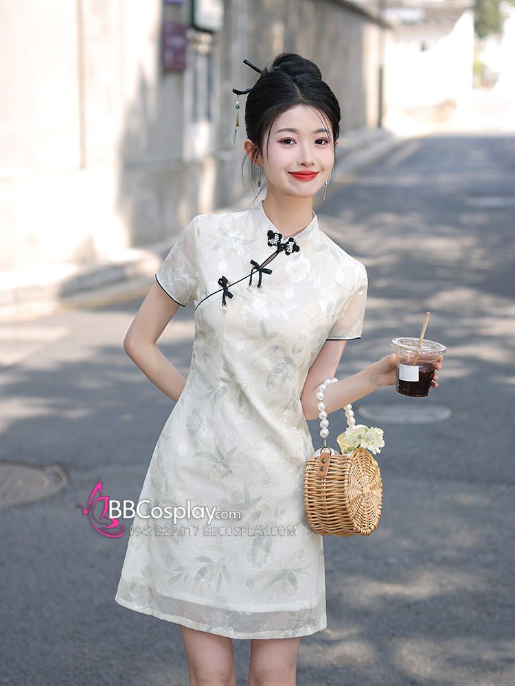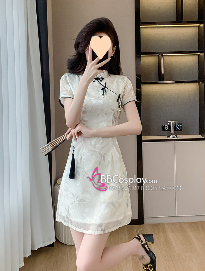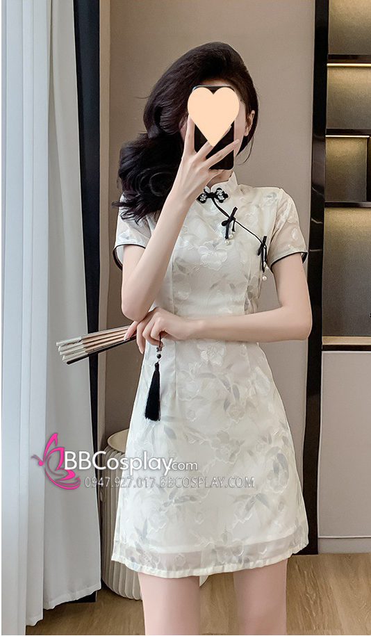 Sườn Xám Hiện Đại Voan Mềm Viền Đen