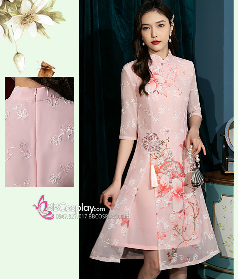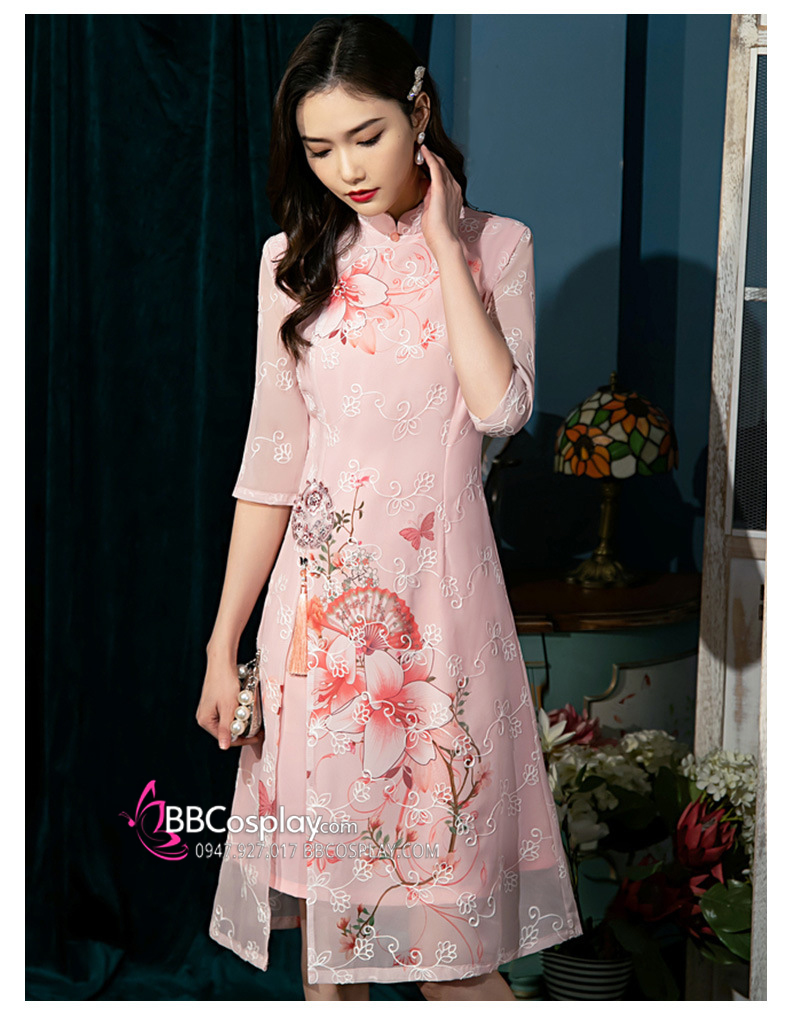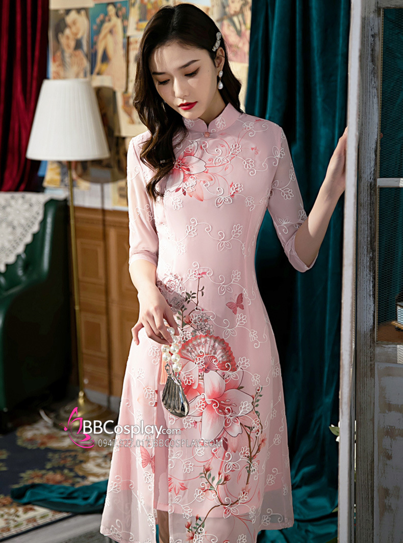 Sườn Xám Hiện Đại Voan Mềm Nền Hoa Lily - Màu Hồng