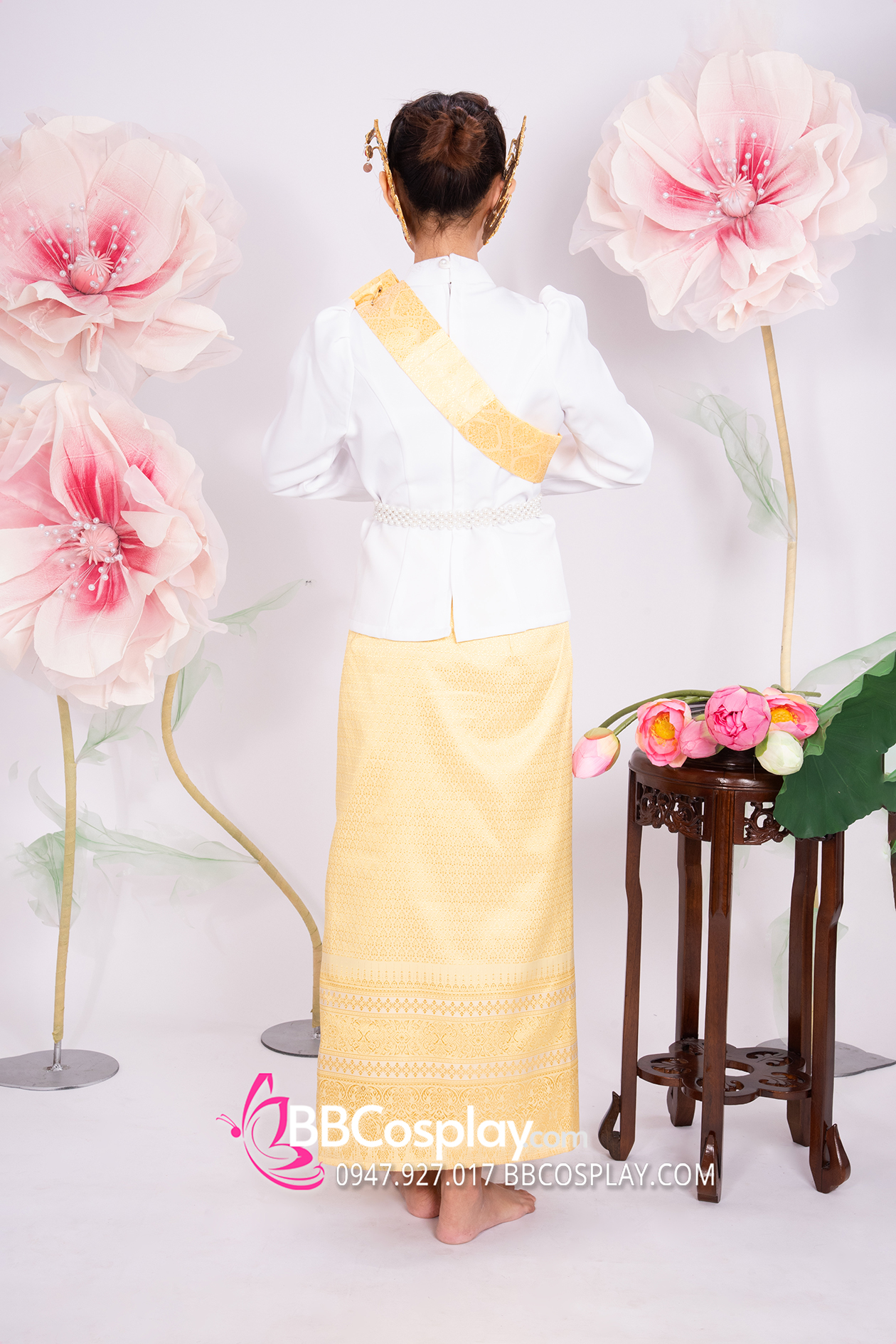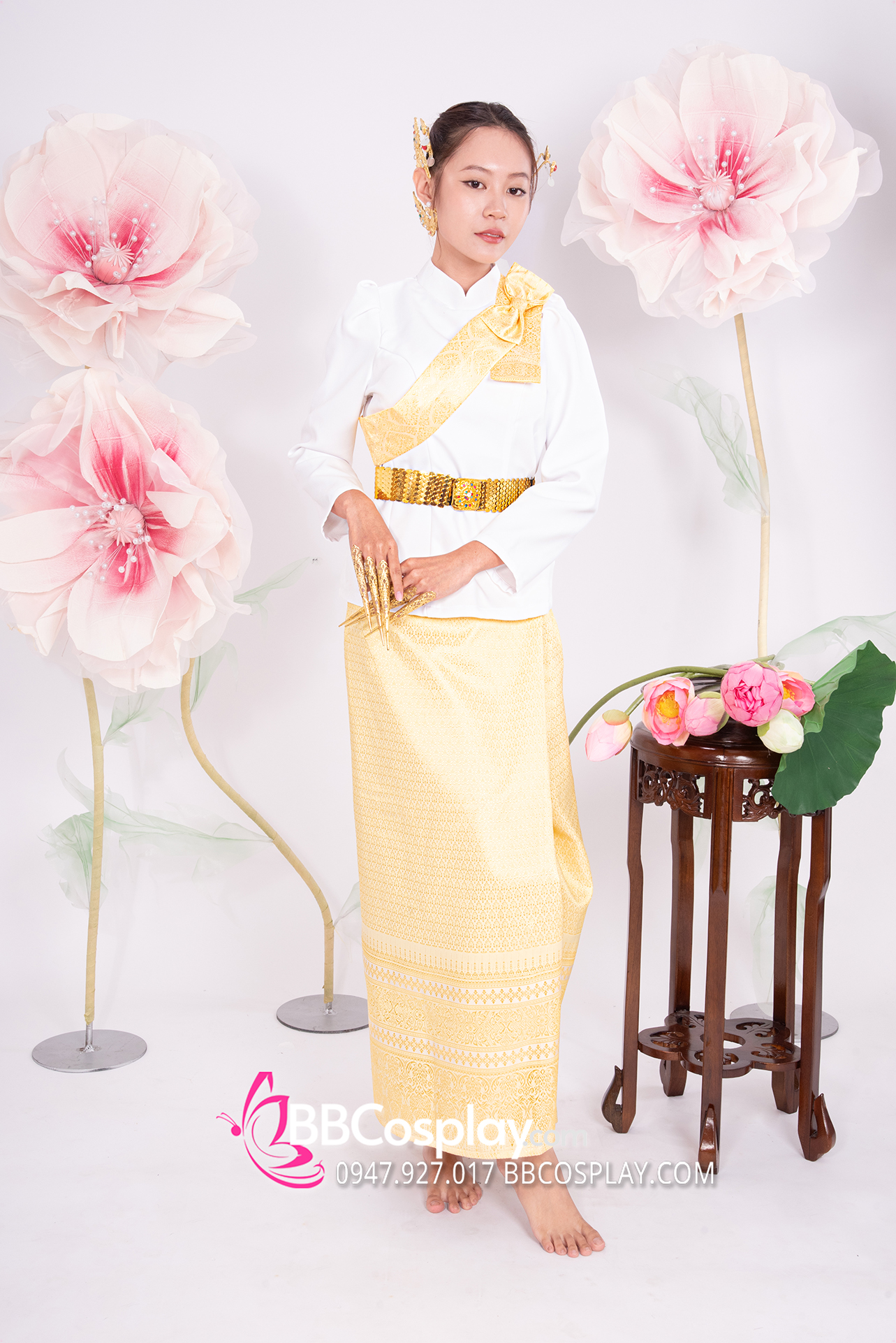 Trang Phục Khmer Áo Trắng Tay Phồng Váy Gấm Vàng Kèm Khăn Vai