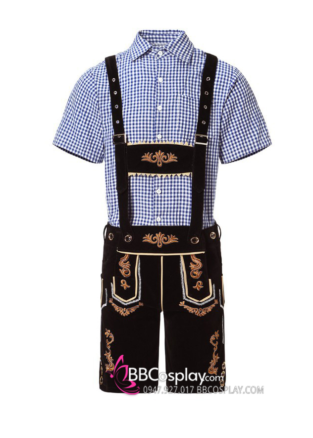 Trang Phục Bia Đức Cho Nam Áo Caro Xanh Tay Ngắn Quần Đen Nhung Thêu Hoa Nâu