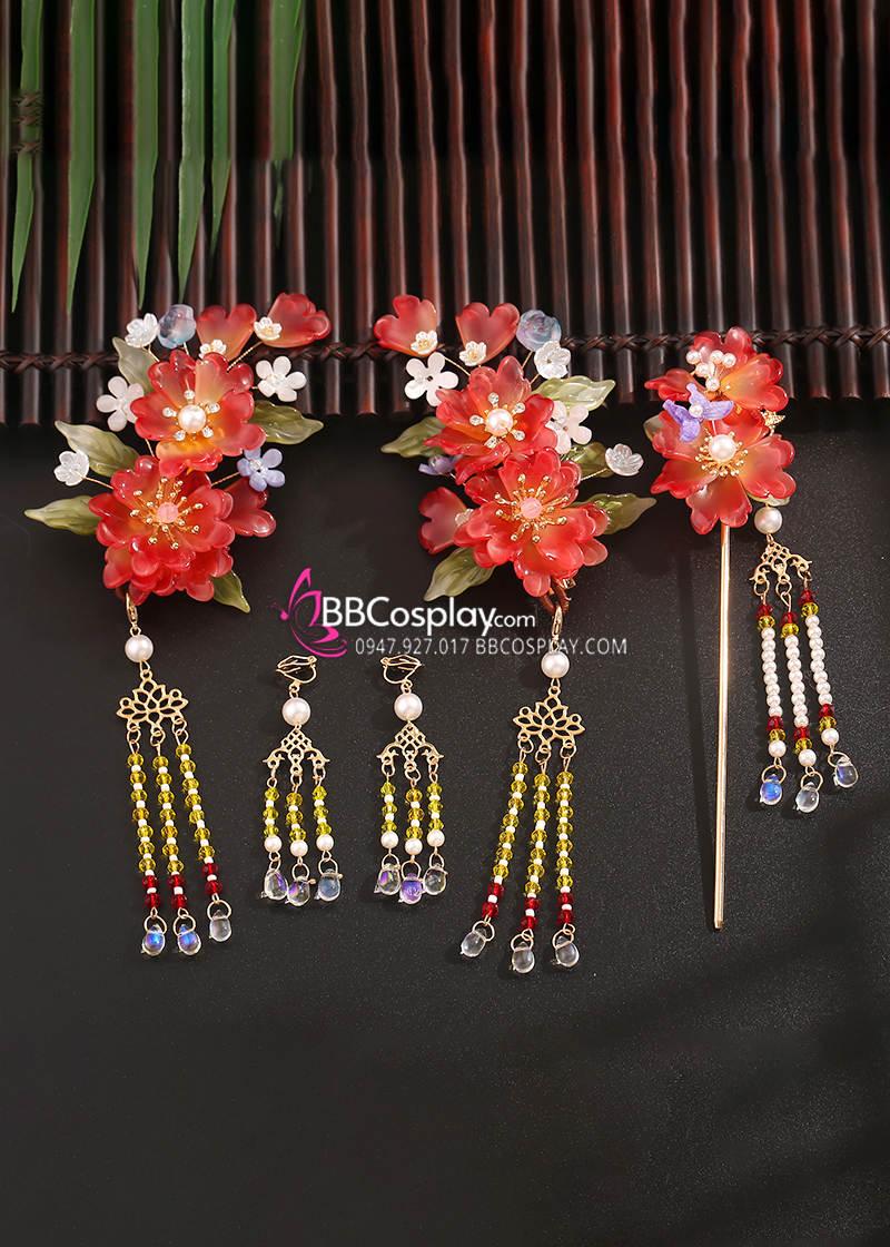 Bộ Trâm Cài Hằng Nga 5 Món Sắc Đỏ Hương Xuân