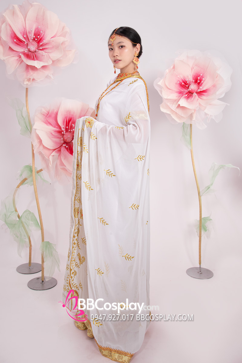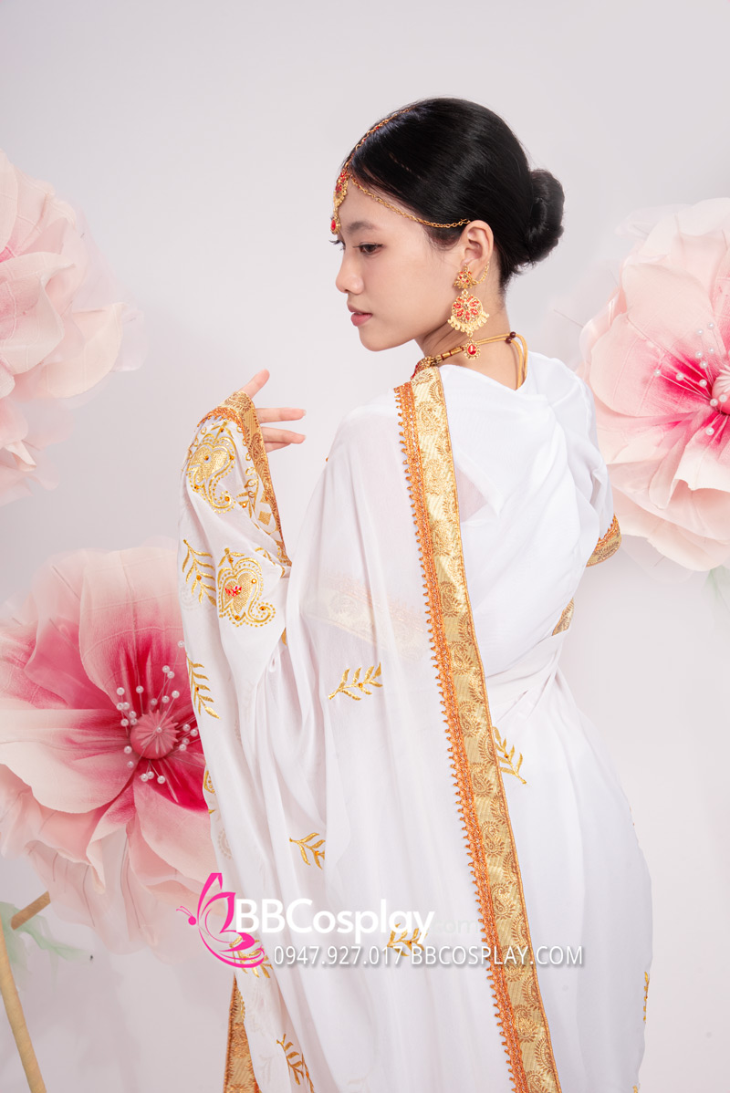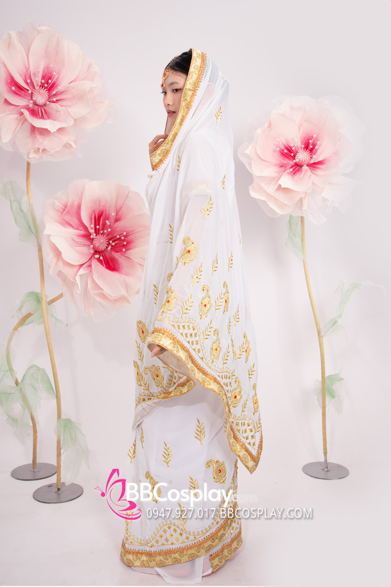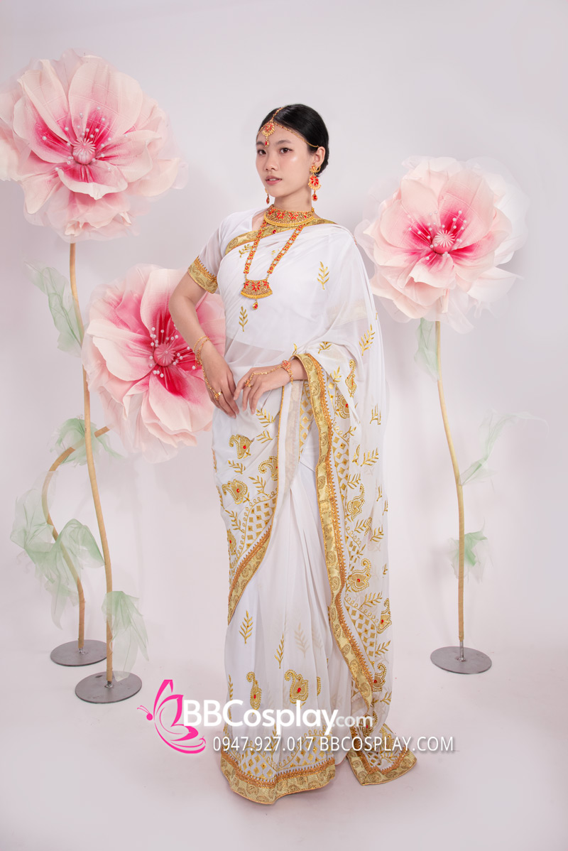 Trang Phục Sari Ấn Độ Trắng Viền Vàng