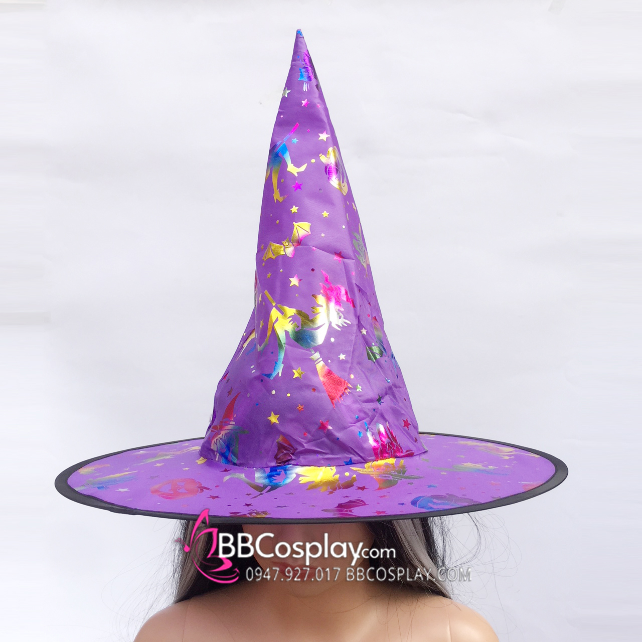 Nón Phù Thủy 1 Lớp Màu Tím Hình Phù Thuỷ Hologam