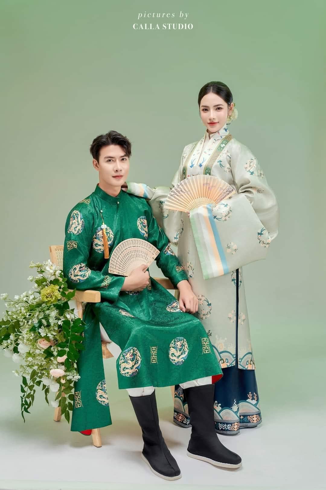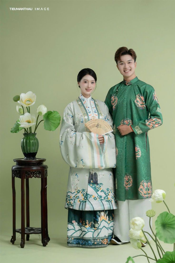 Trang Phục Cặp Đôi Việt Phục Ngũ Thân Tone Xanh Lá - Hoạ Tiết In