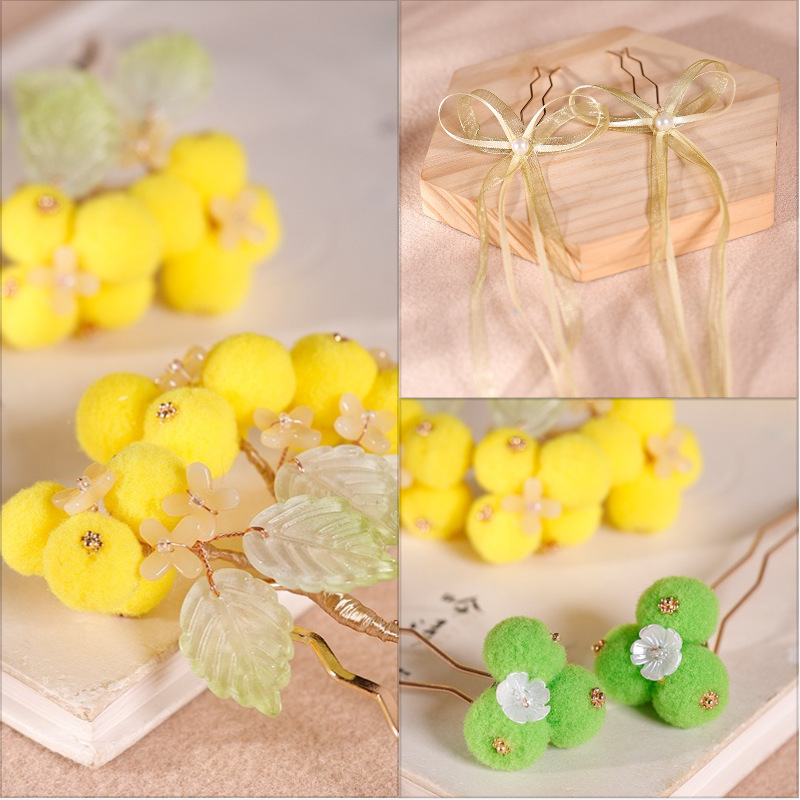 phụ kiện tóc ( kẹp tua rua + hoa nhí xanh + hoa lớn vàng)