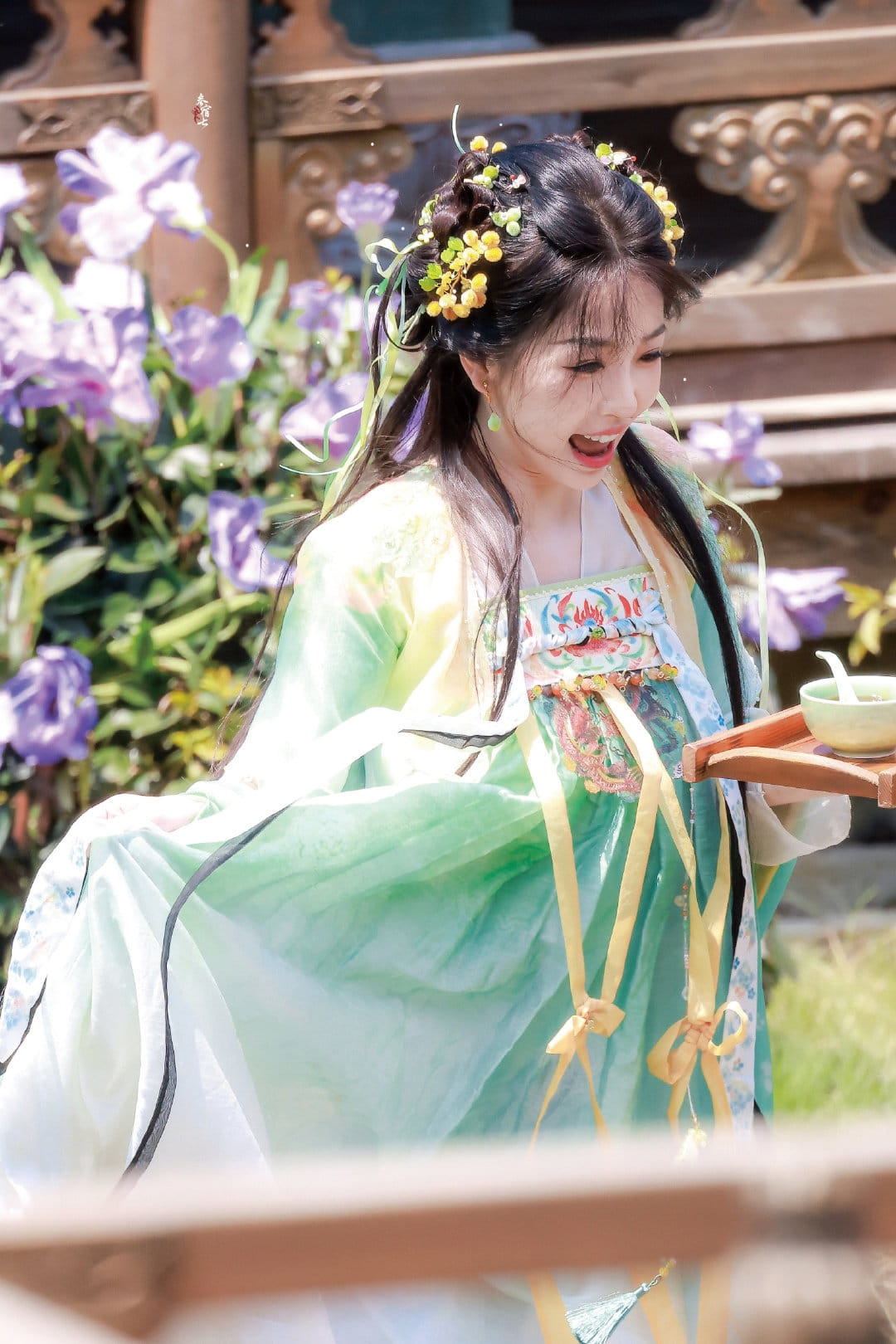 áo trên + váy ngang ngực + phi bạch + khoác xanh + dây cột
