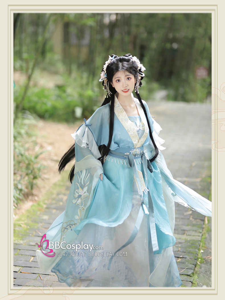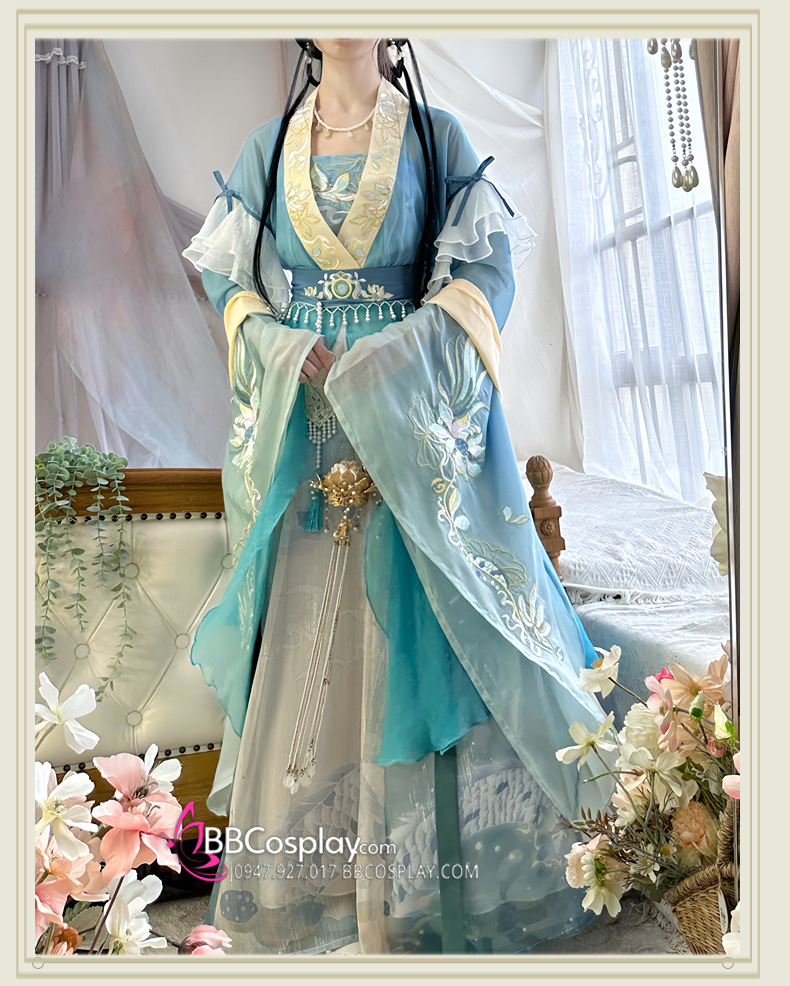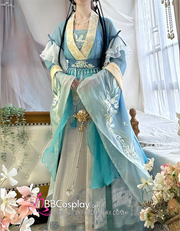 Thành phần: áo yếm dây + áo dài tay rộng + chân váy + áo choàng + phi bạch + phù đai ( phụ kiện thắt lưng)