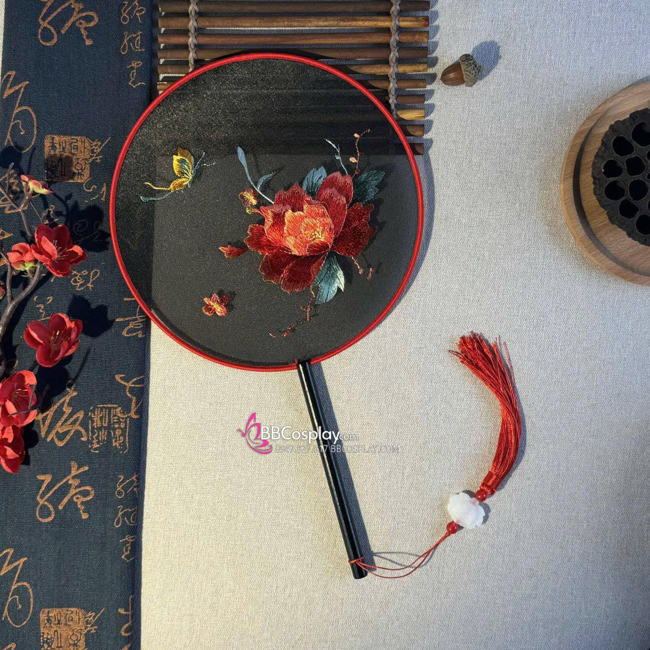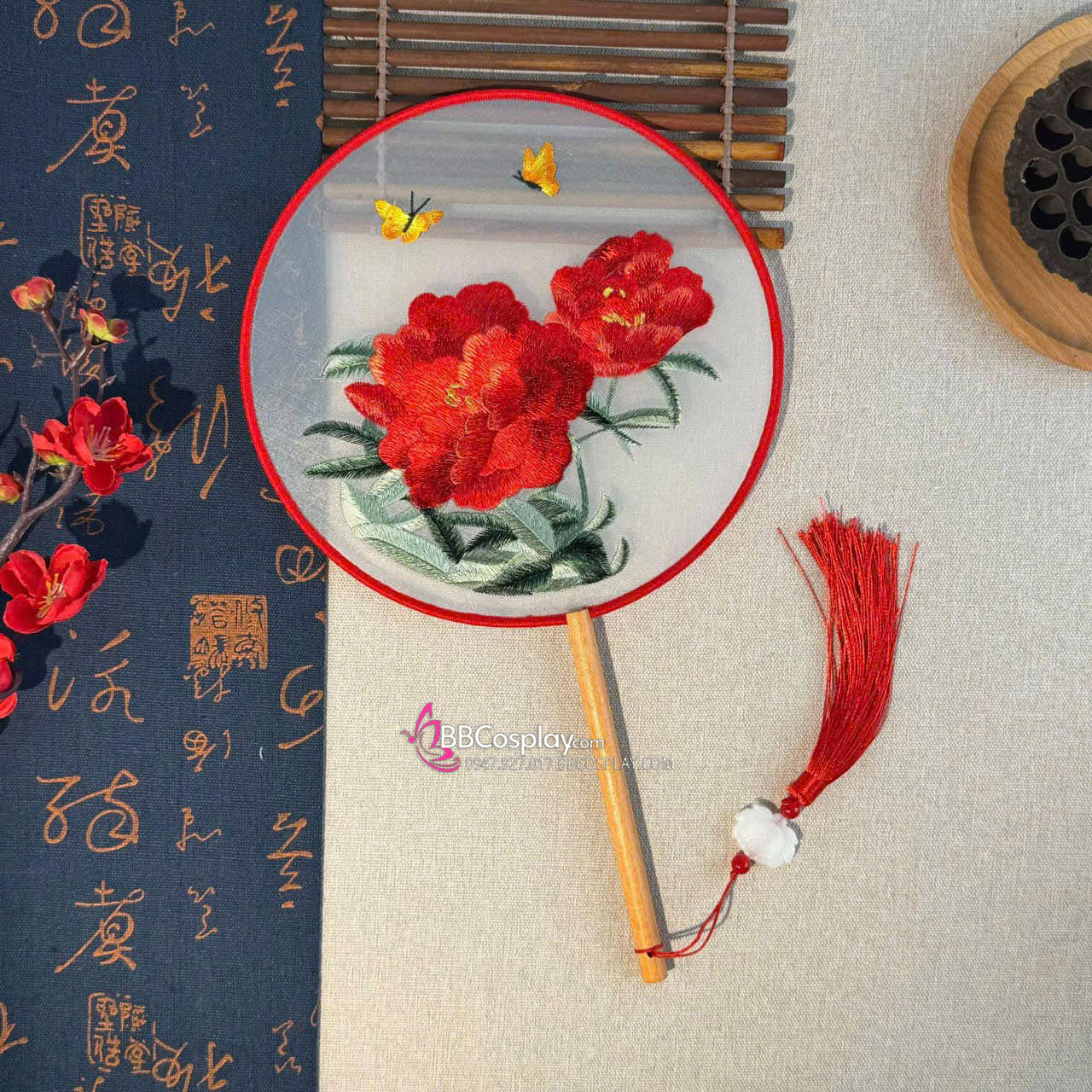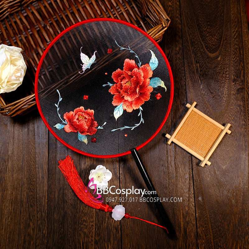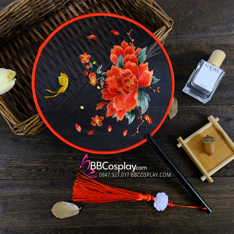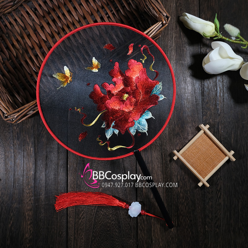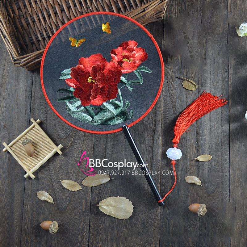 Quạt Thêu Mẫu Đơn Bướm Lượn - Mẫu Quạt Tròn