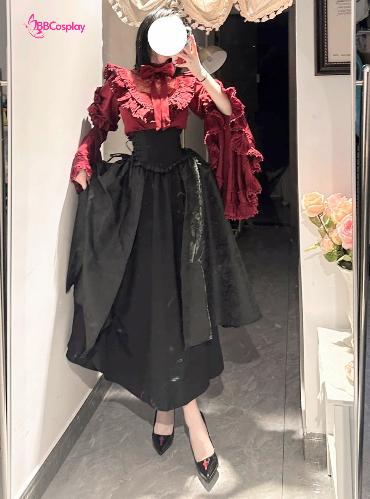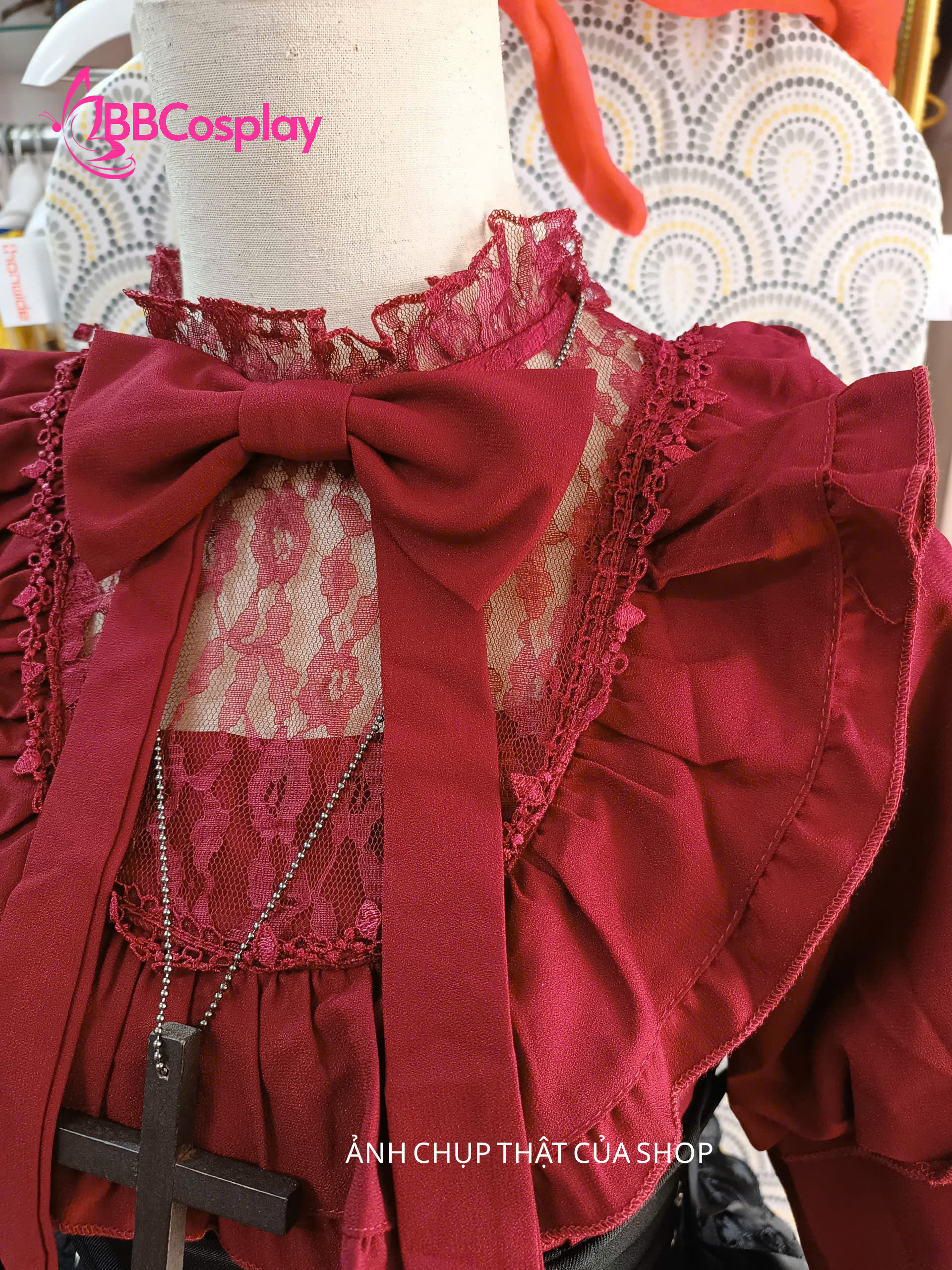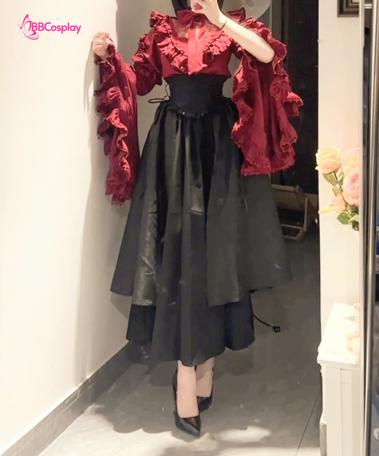 ( TRỌN BỘ) áo sơ mi đỏ tay loe + chân váy đen nhấn eo + tùng phồng lưới + găng tay lưới + dây chuyền thánh giá gỗ