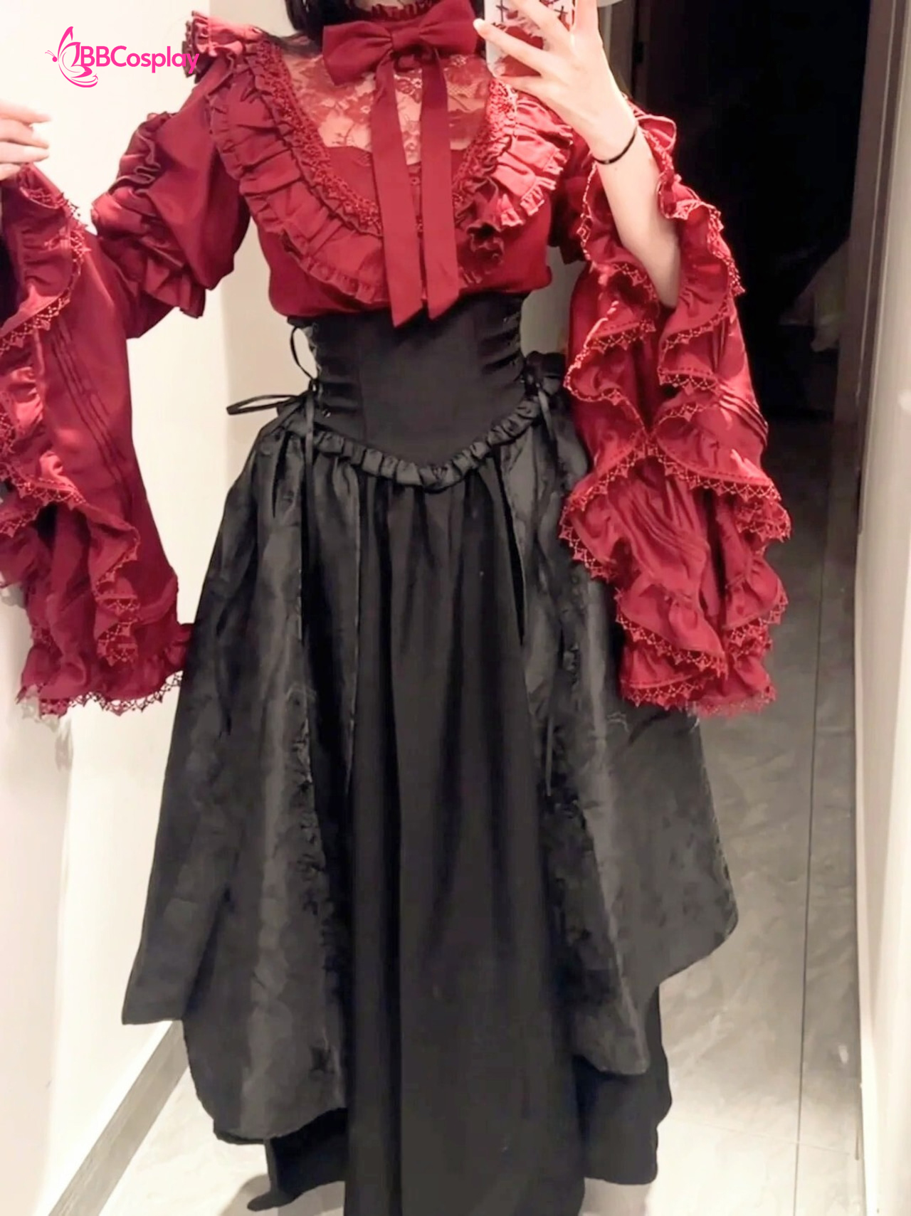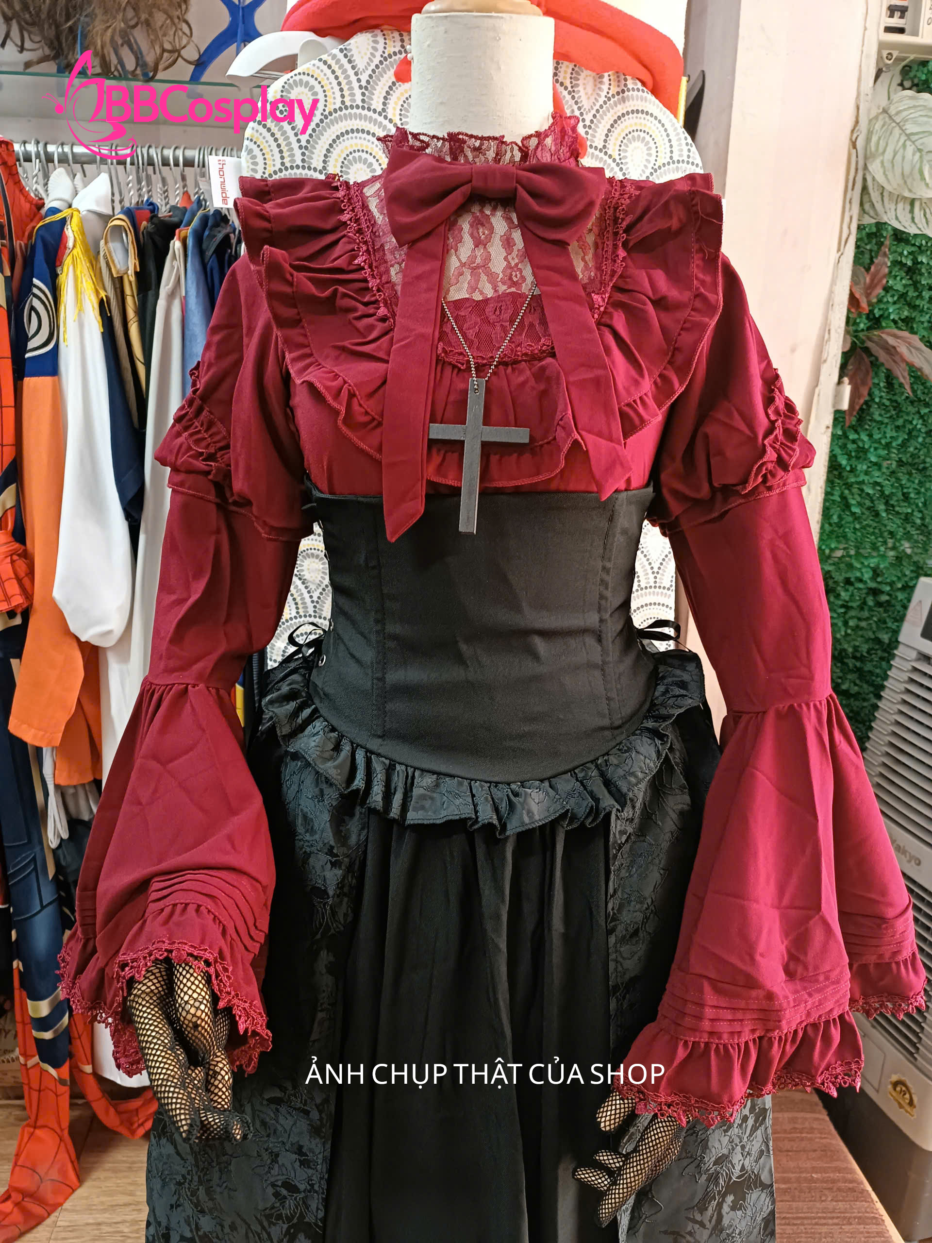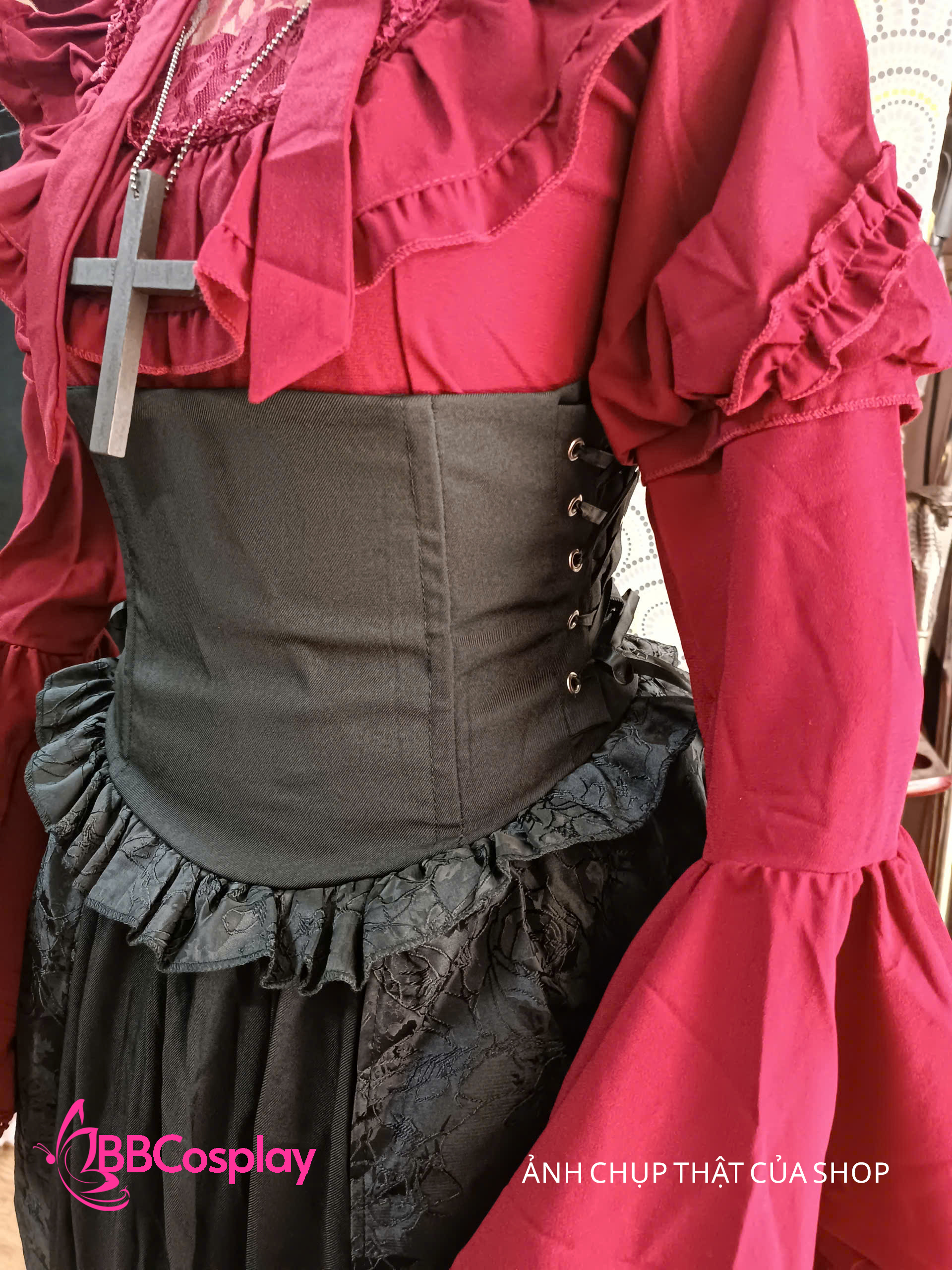 ( TRỌN BỘ) áo sơ mi đỏ tay loe + chân váy đen nhấn eo + tùng phồng lưới + găng tay lưới + dây chuyền thánh giá gỗ