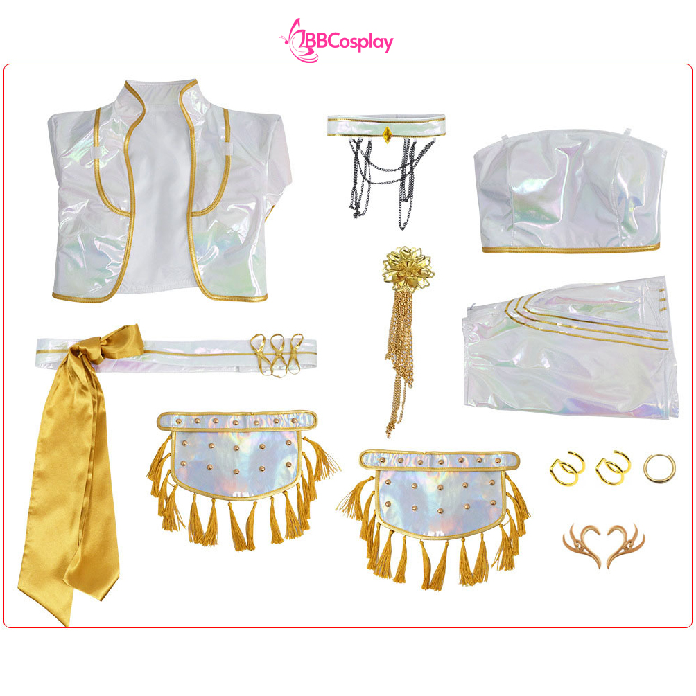 - Thành phần: áo + quần + thắt lưng + vòng cổ + phụ kiện đeo áo + 2 khuyên vành tai + 2 phụ kiện vai + 3 khuyên tai