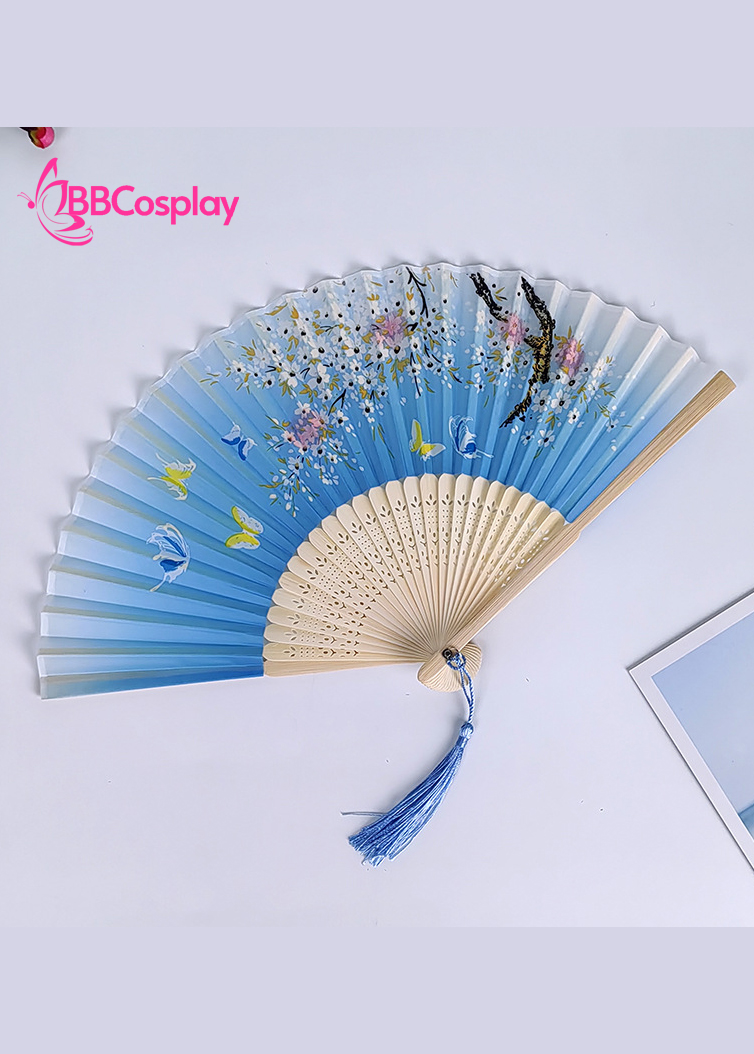 Quạt Xếp Nhật Bản Xanh Dương Đào Và Bướm