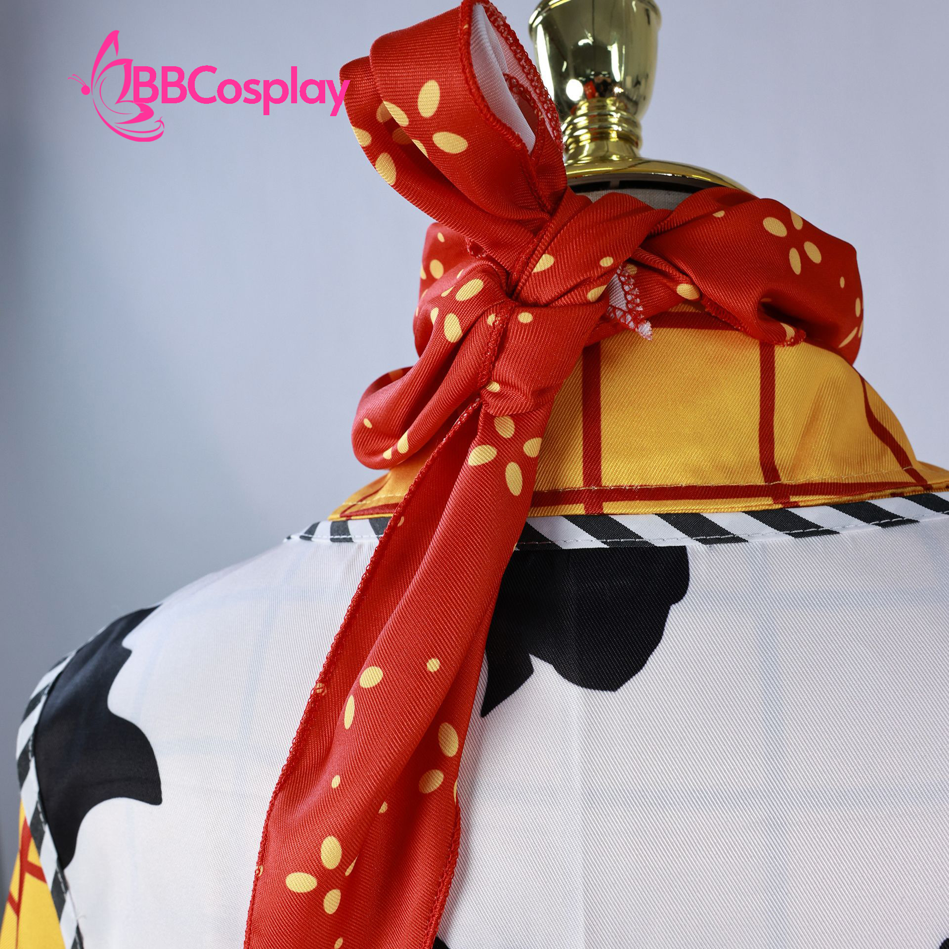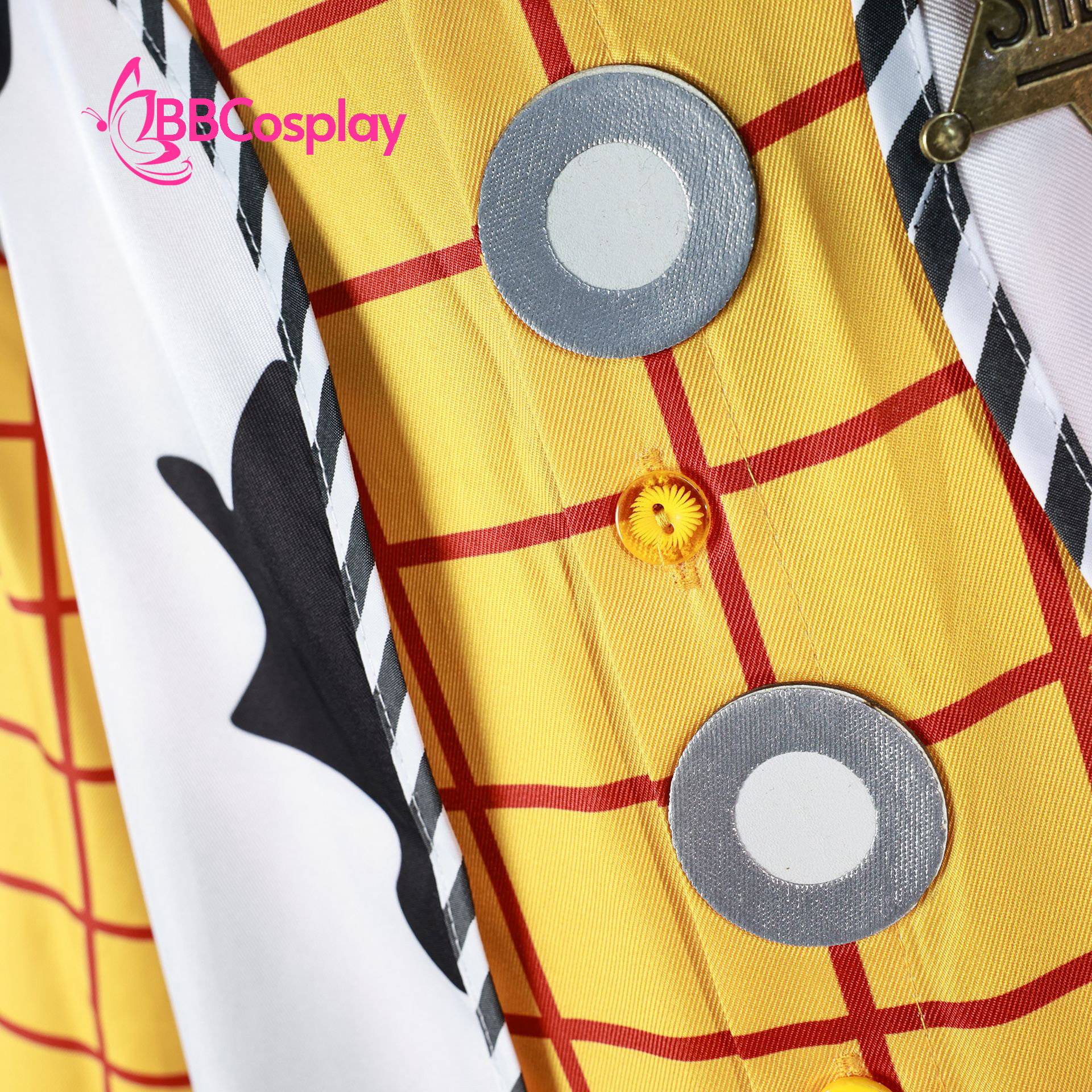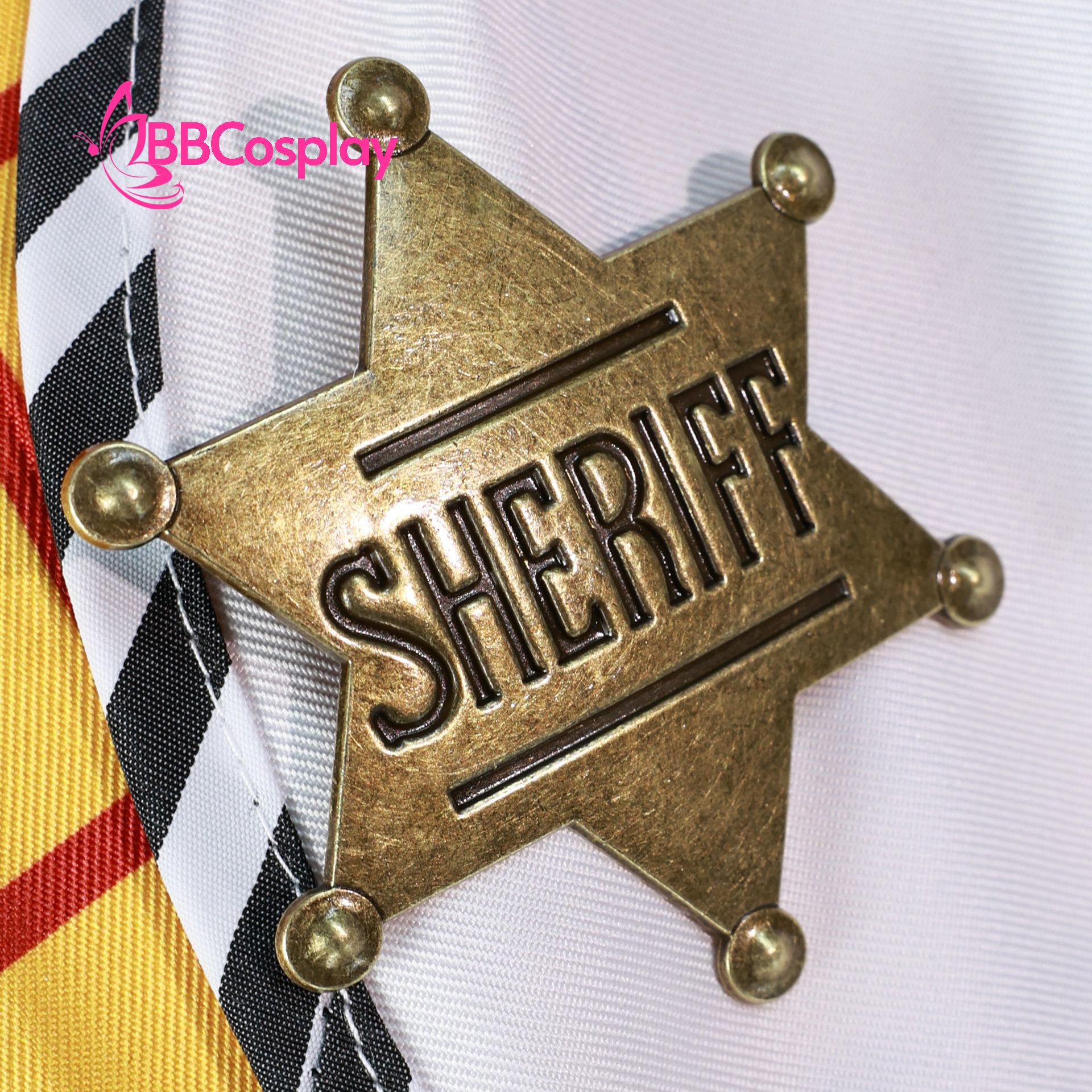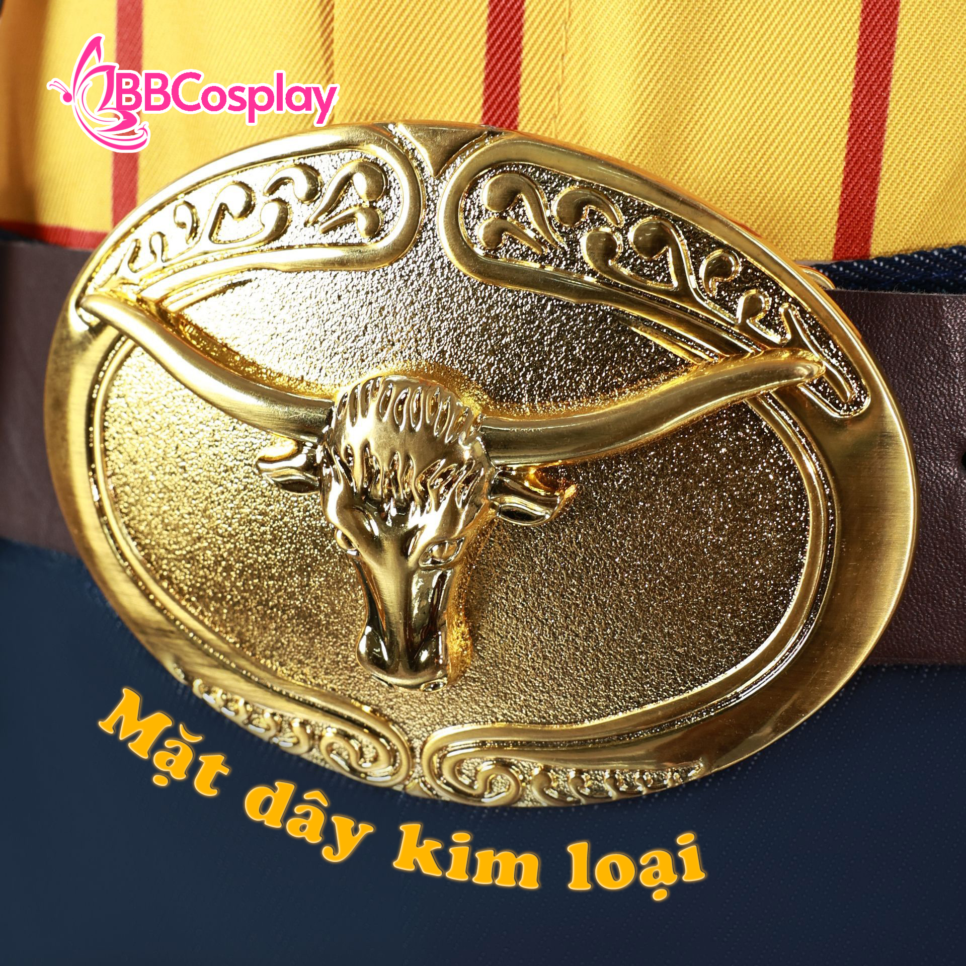 - Thành phần: áo vàng sọc đỏ + quần tây xanh đen + thắt lưng nâu có đai kim loại + áo khoác trắng hoạ tiết bò sữa + khăn cổ đỏ + nón cao bồi + huy hiệu cảnh sát kim loại