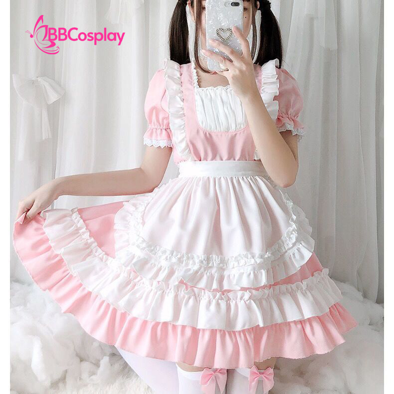 Đồ Nàng Hầu Maid Hồng Tạp Dề Trắng Kèm Nhiều Nơ