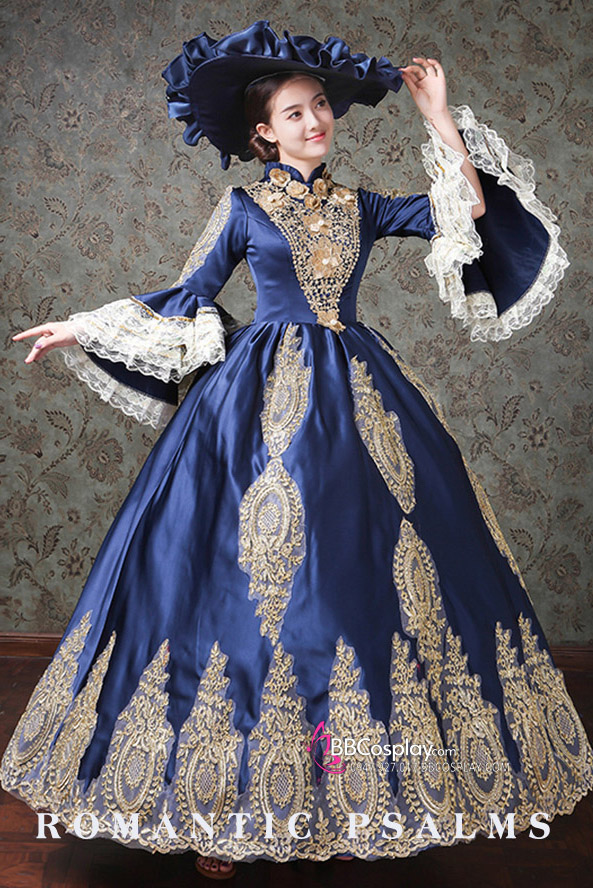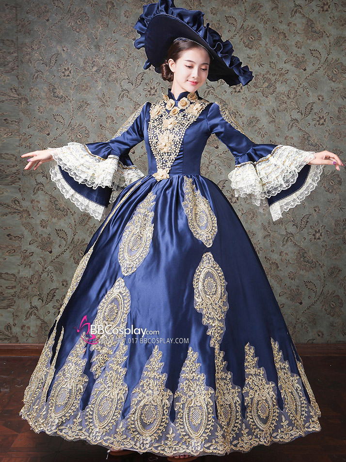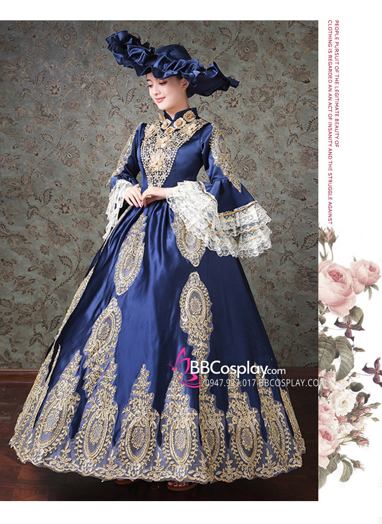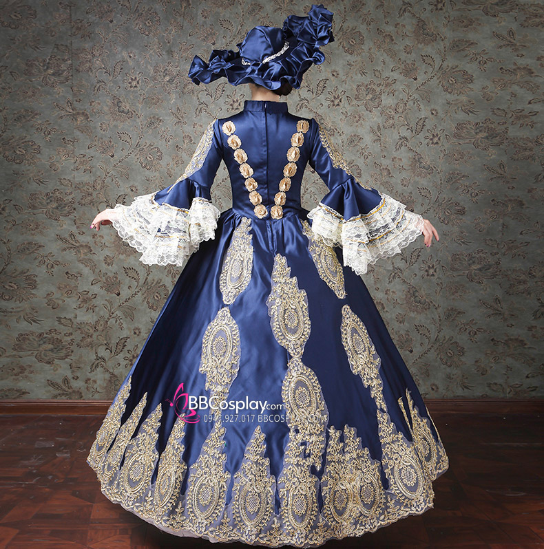 Đầm Bá Tước Châu Âu Xanh Navy Phối Ren 17Th Century