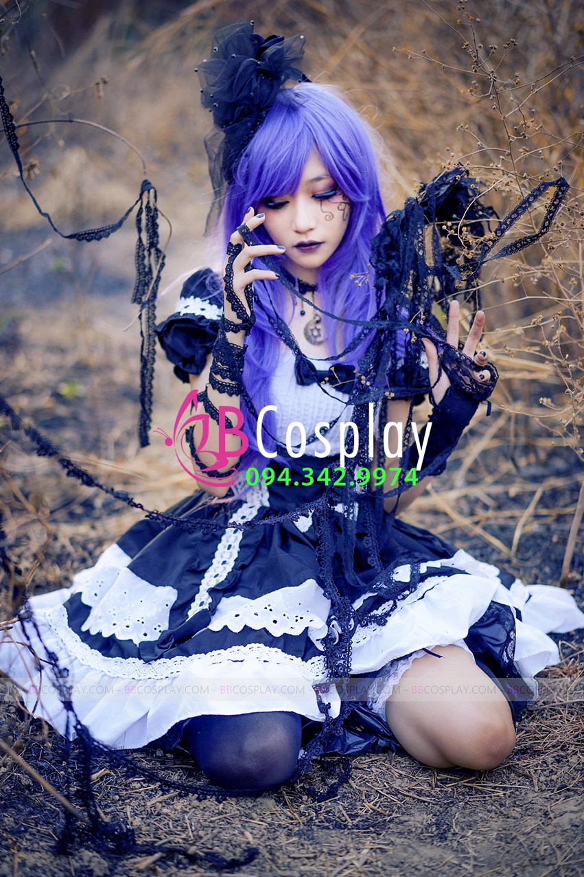 Trang Phục Lolita Đen Trắng Thêu Hoạ Tiết Chân Mèo Kèm Chuông Cổ