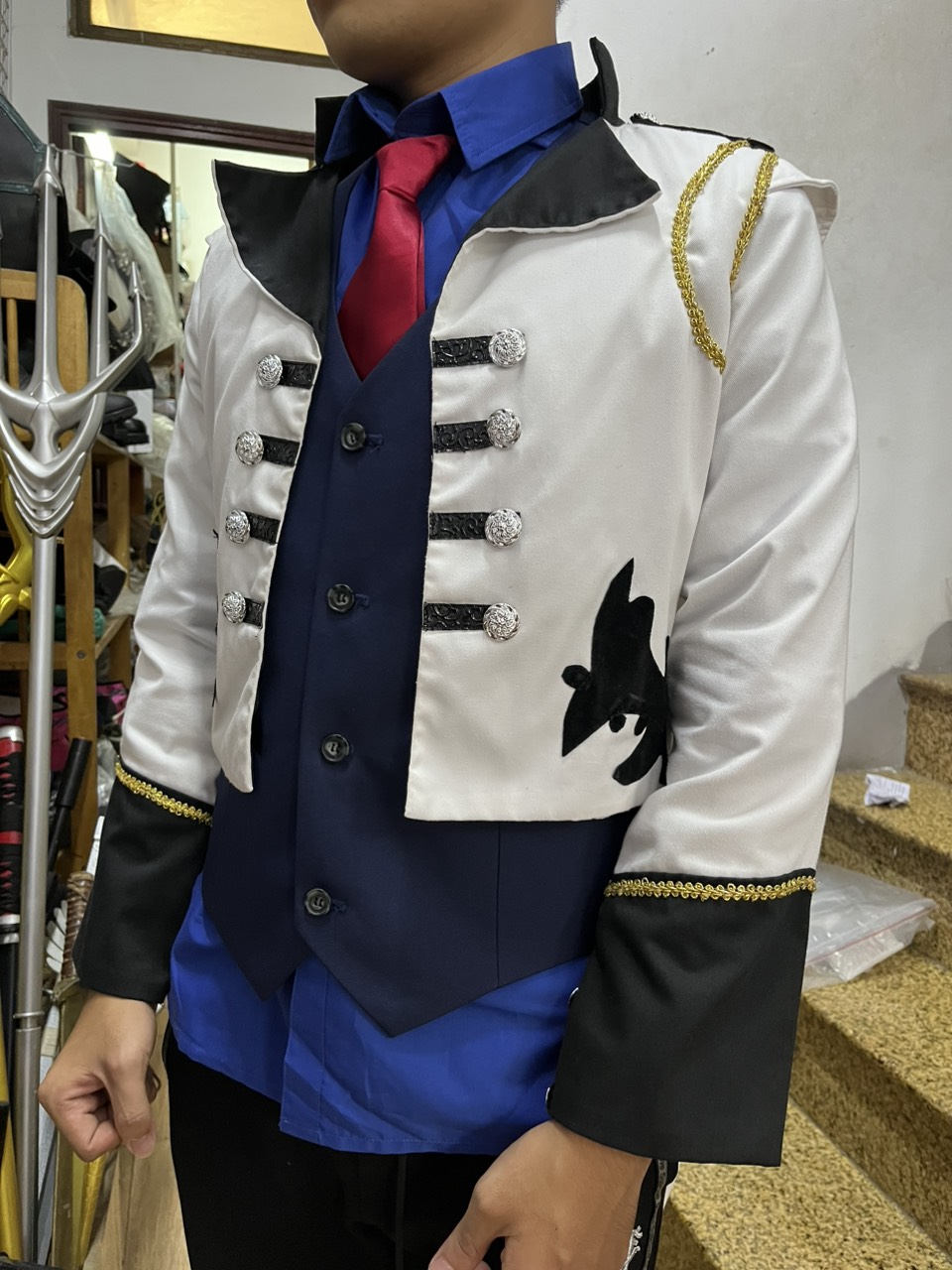áo vest hoàng tử đuôi tôm + ghi lê xanh + áo sơ mi xanh navy tay dài + quần tây đen + cavat đỏ