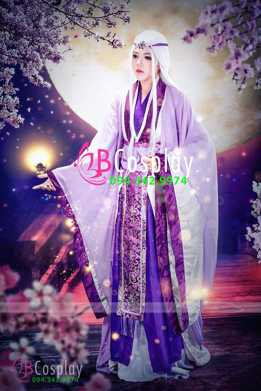 áo voan nhung tím + áo gấm trắng viền tím + áo choàng voan tím + váy dài + đai