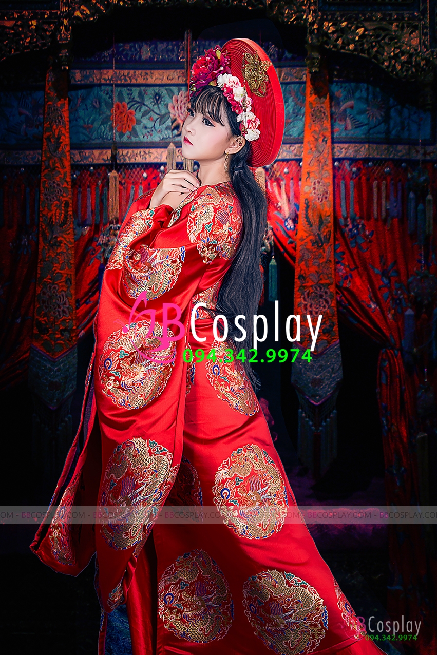 yếm gấm đỏ + váy dài + áo gấm + thắt lưng + mấn đính hoa