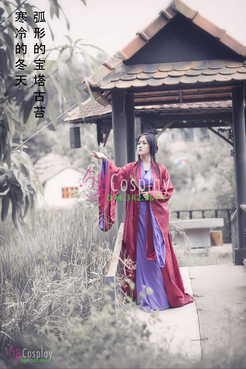 áo yếm + váy dài + lớp áo voan nhung tím + lớp áo đỏ đô + đai