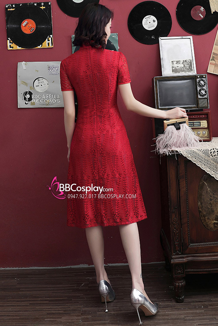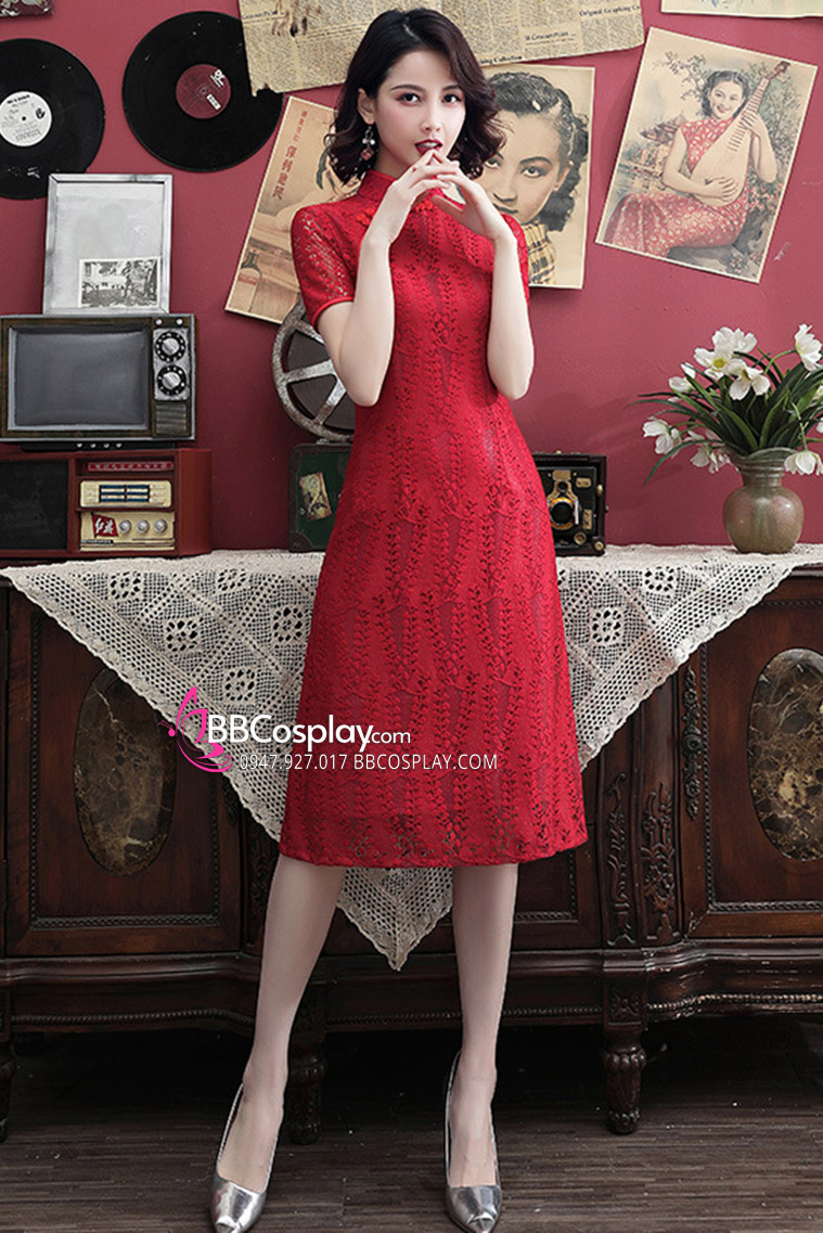 Sườn Xám Thượng Hải Cổ Điển Đỏ Ren Lá Liễu Xẻ Tà