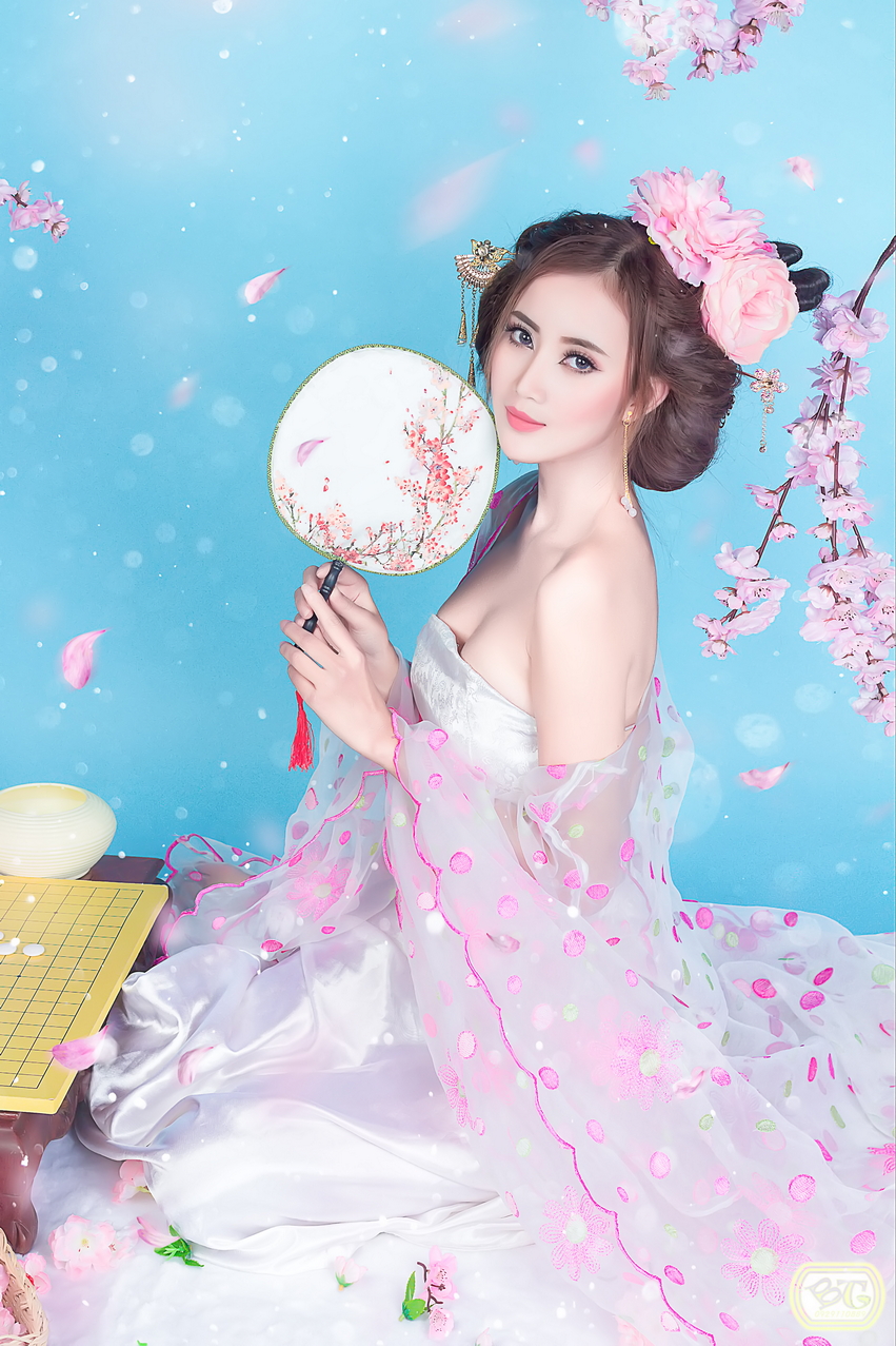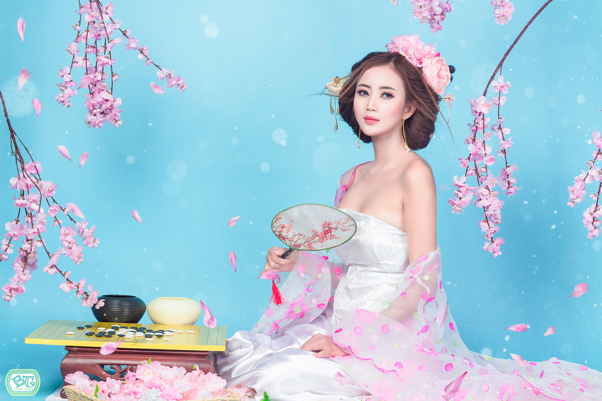 yếm gấm trắng + váy trắng + áo choàng voan thêu hoa