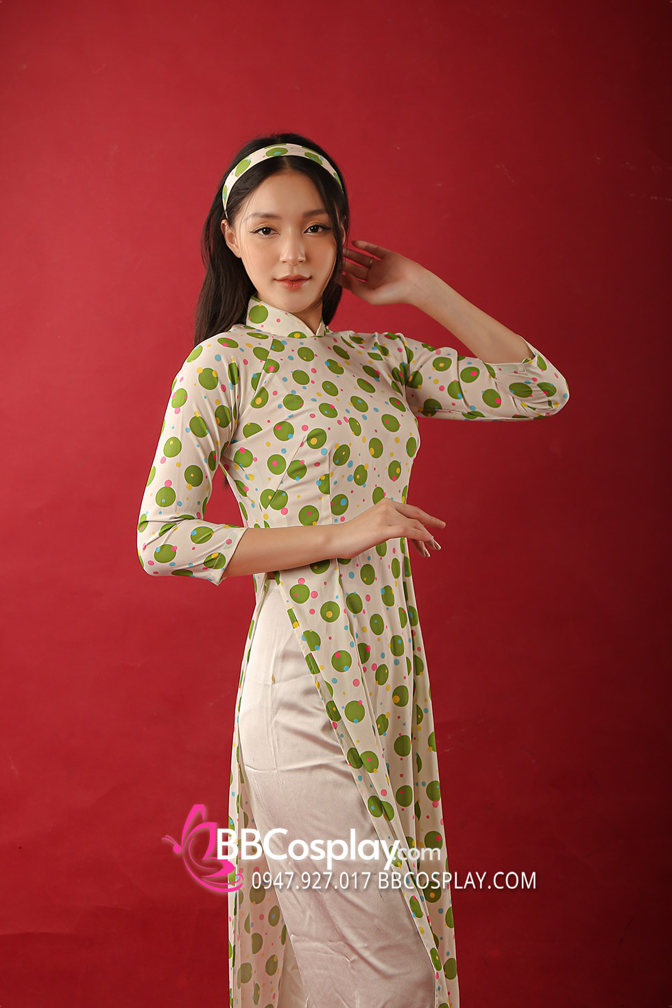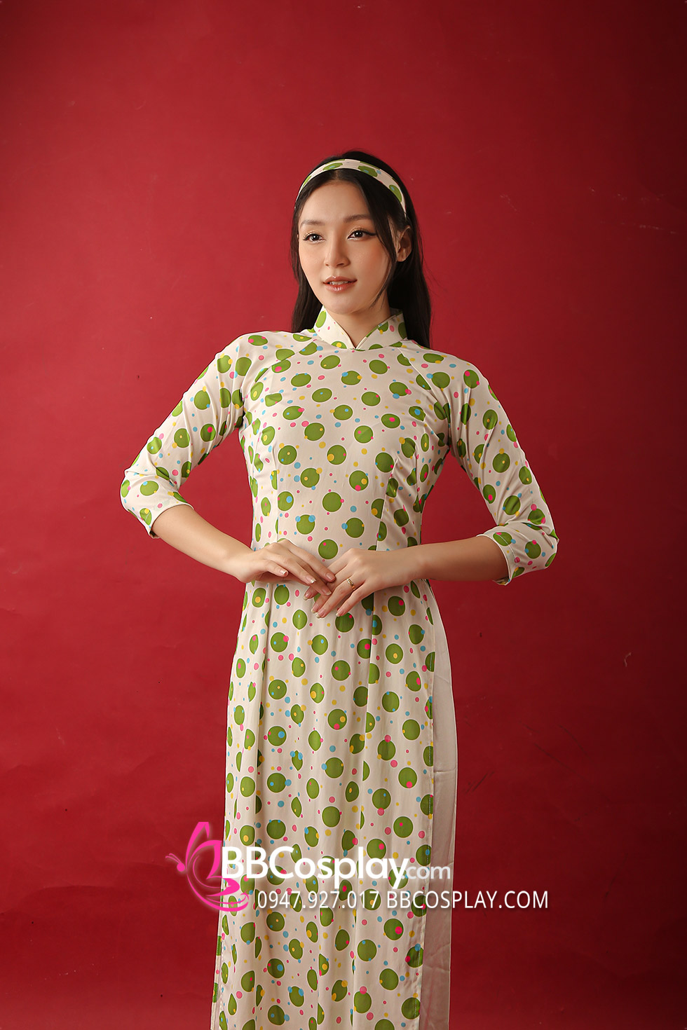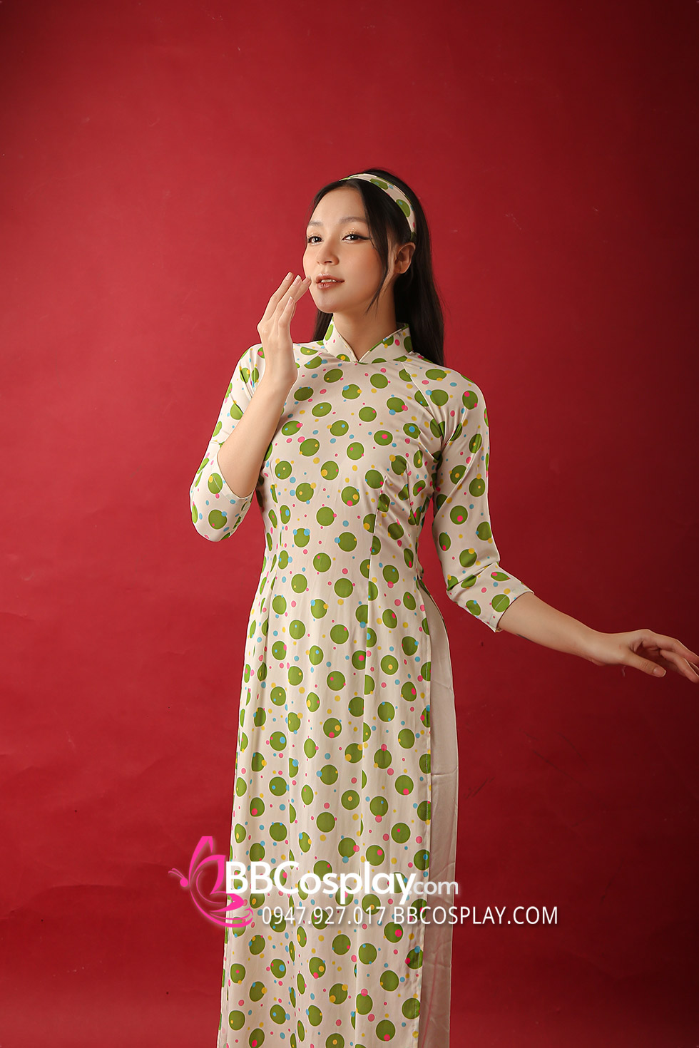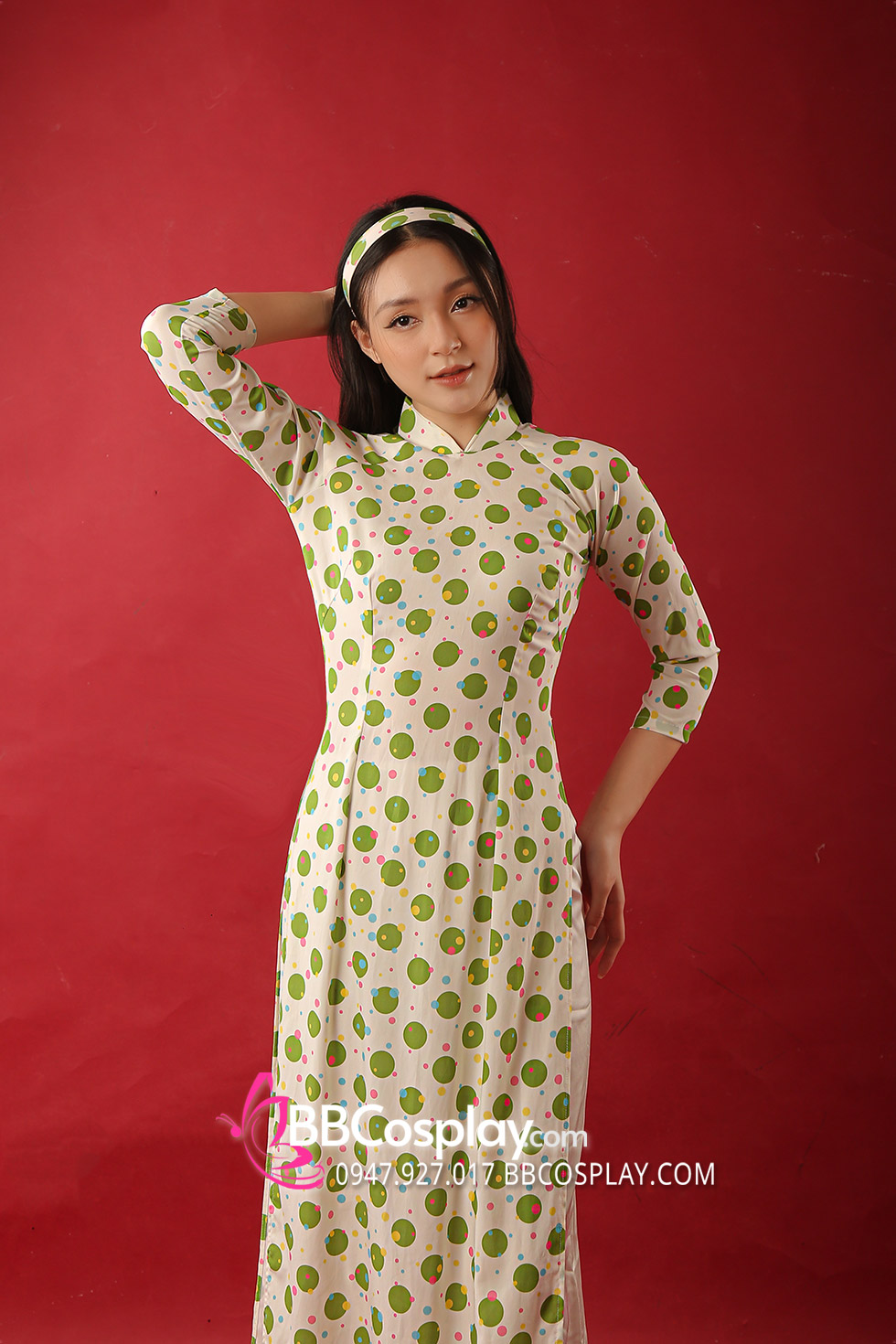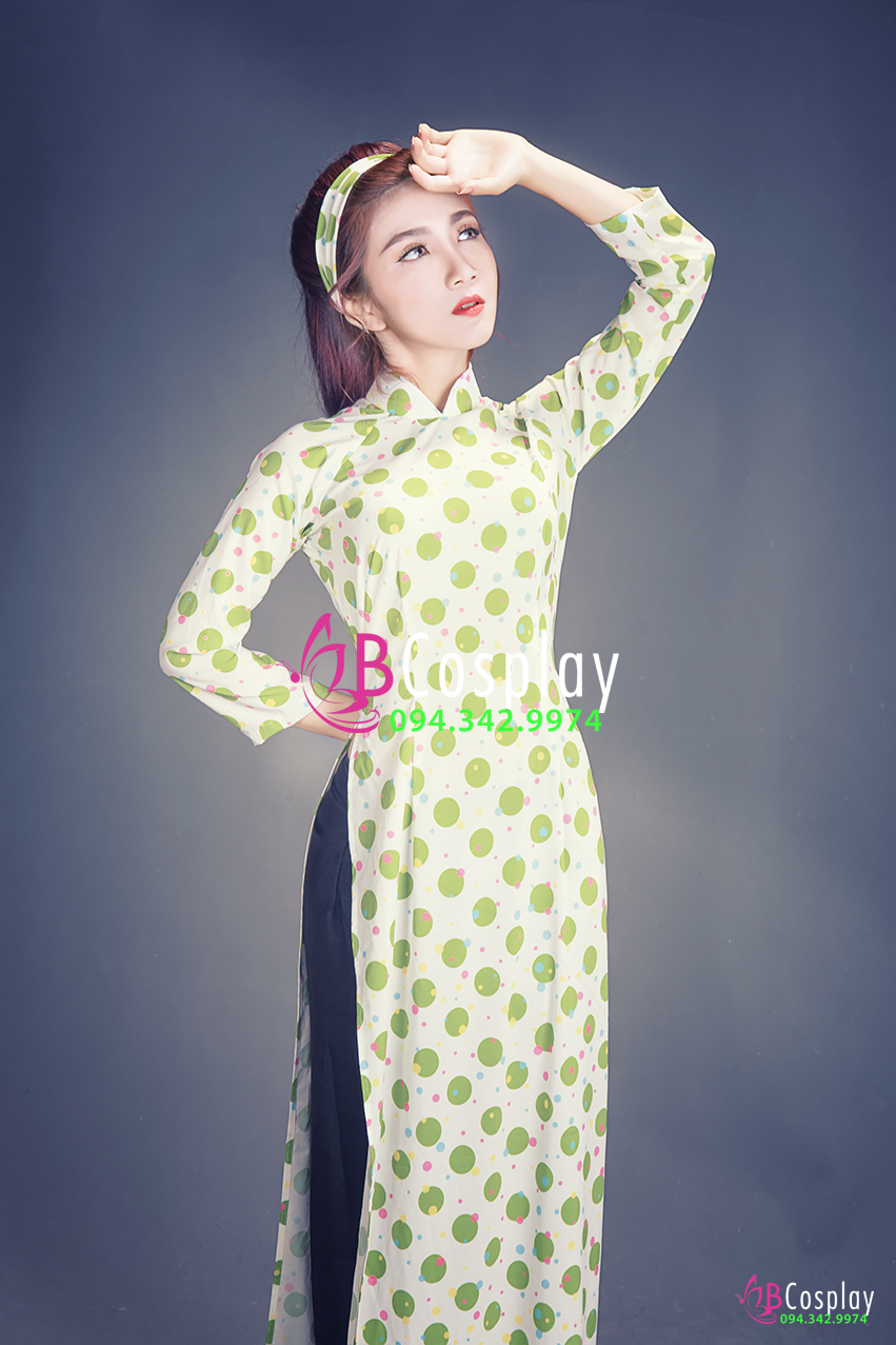 Áo Dài Cô Ba Sài Gòn Trắng Chấm Bi Xanh Lá
