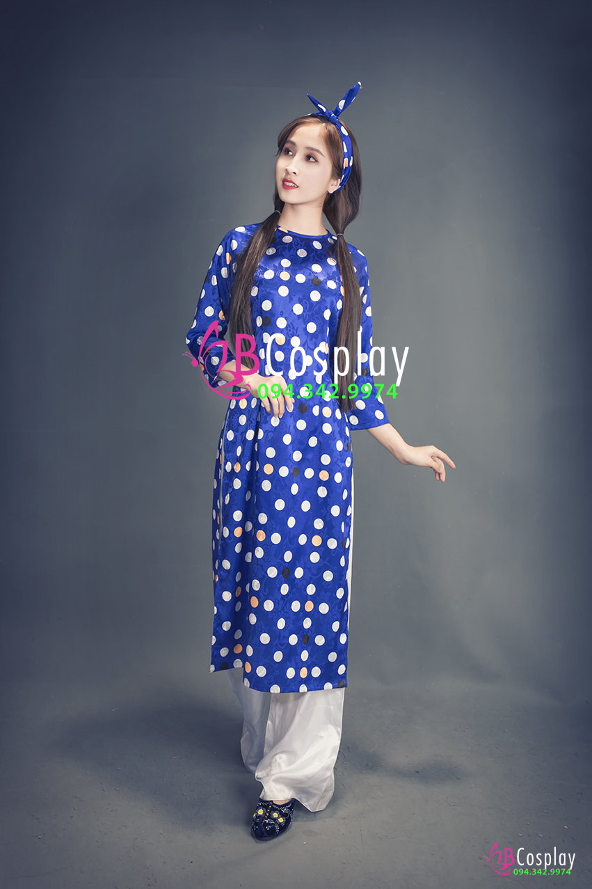 Áo Dài Cô Ba Sài Gòn Xanh Chấm Bi Cổ Tròn